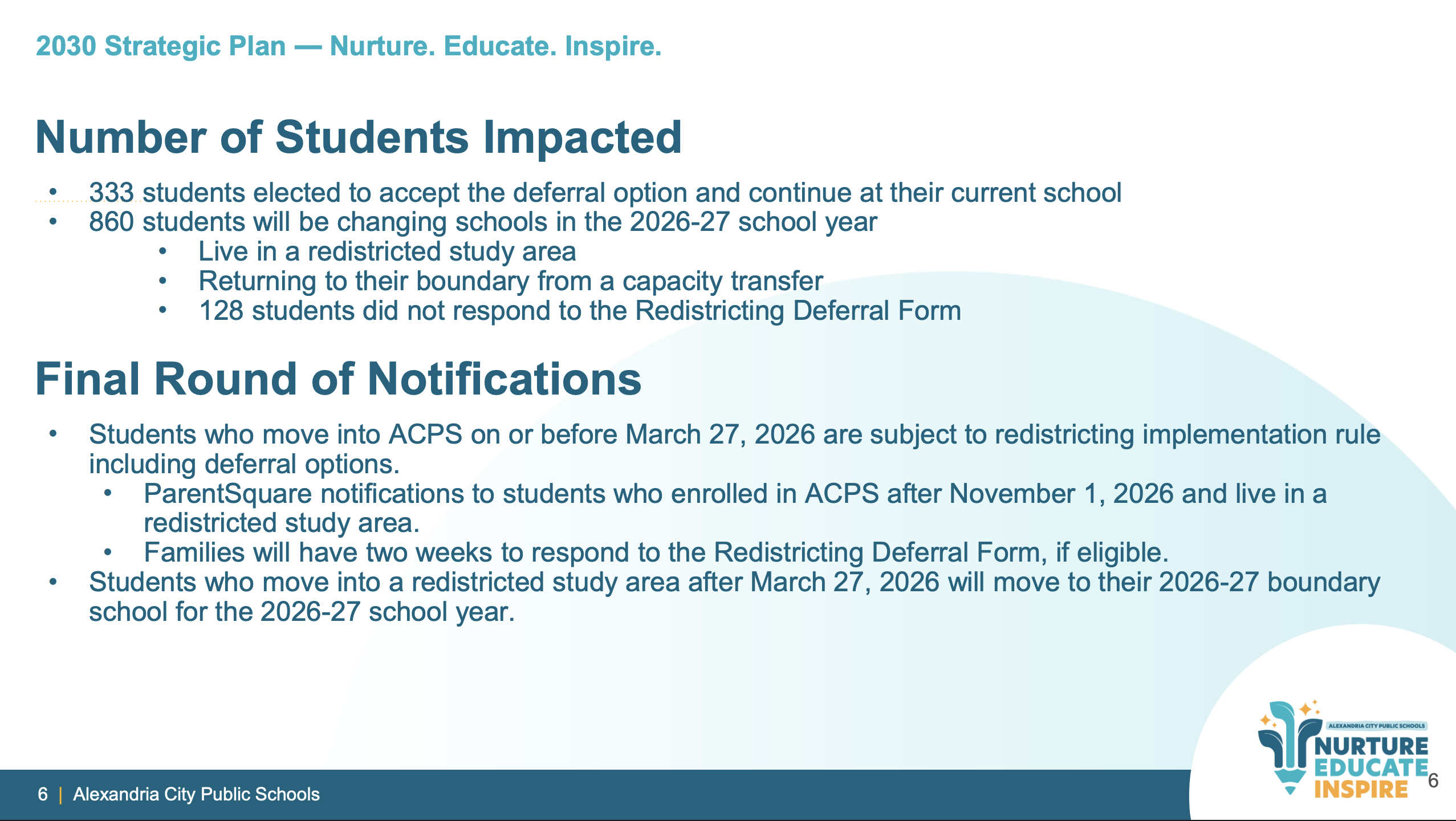 One deadline lands this week: students who enroll in ACPS on or before Friday, March 27 are still subject to redistricting implementation rules, including deferral options. Students who move into a redistricted area after March 27 will automatically attend their 2026-27 boundary school.