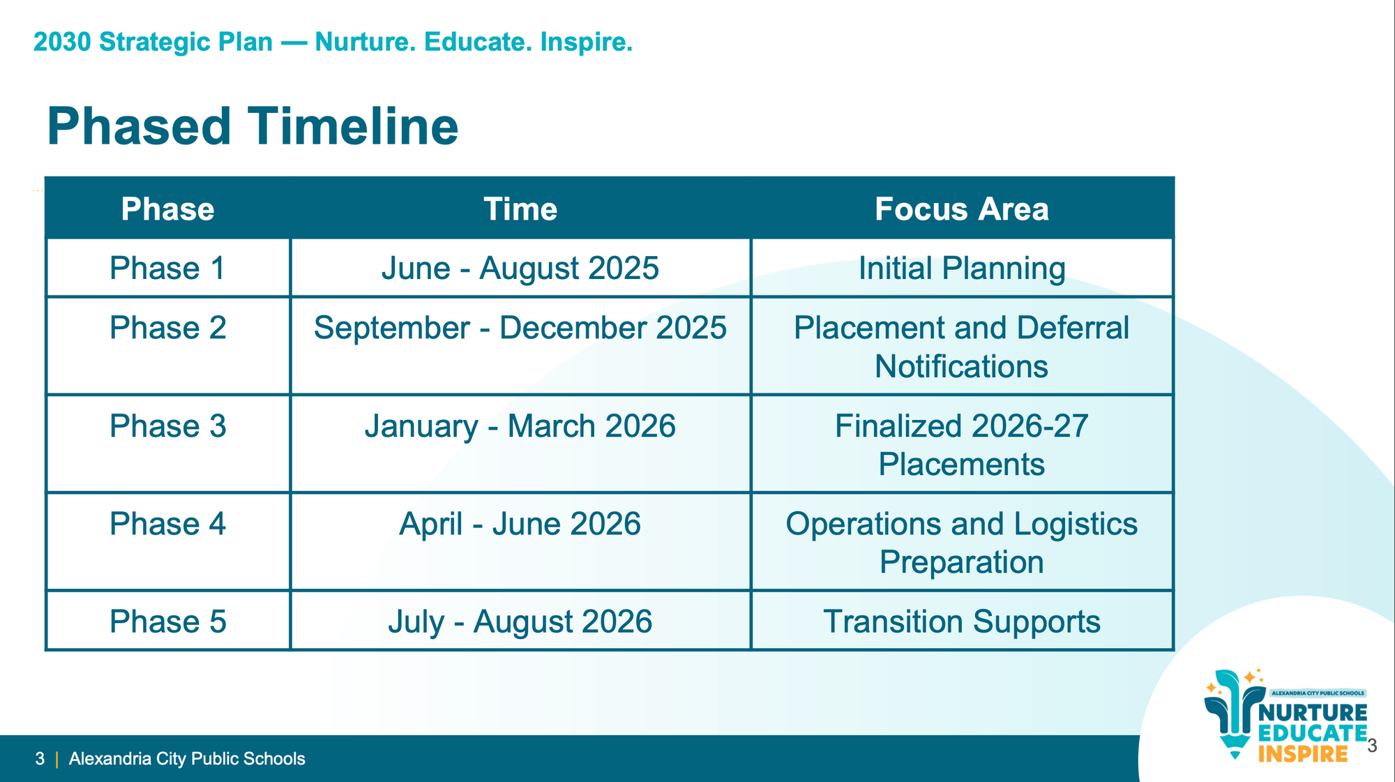 Thursday's presentation marks the close of Phase 3 — finalized placements — and the handoff to Phase 4: operations and logistics, running April through June. That phase will involve reassigning staff, updating bus routes, procuring furnishings for buildings with shifting enrollment and finalizing the budget to reflect new staffing allocations. Bus route changes are not expected to be finalized until June and July.