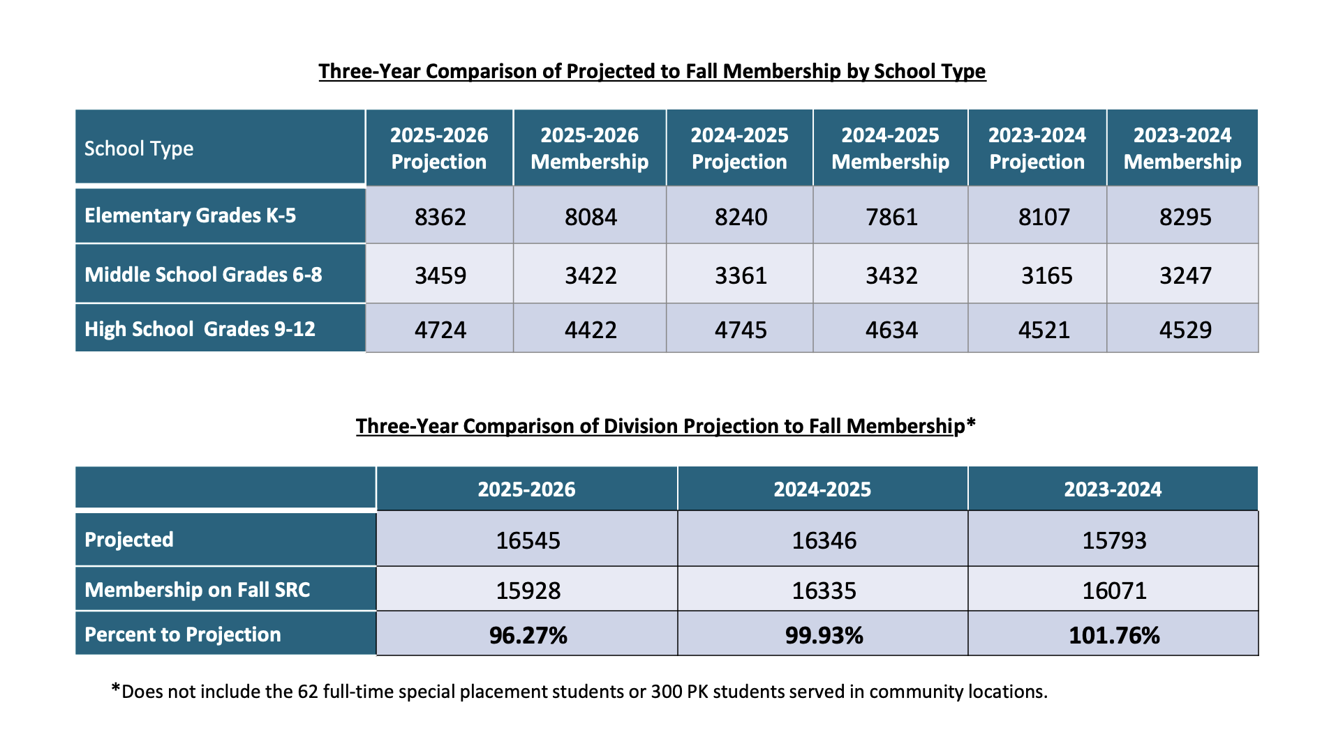 The district had projected 16,545 students for 2025-26 but came in 617 students short, a 96.27% accuracy rate. That compares to near-perfect projection accuracy in the prior two years — 99.93% in 2024-25 and 101.76% in 2023-24.
