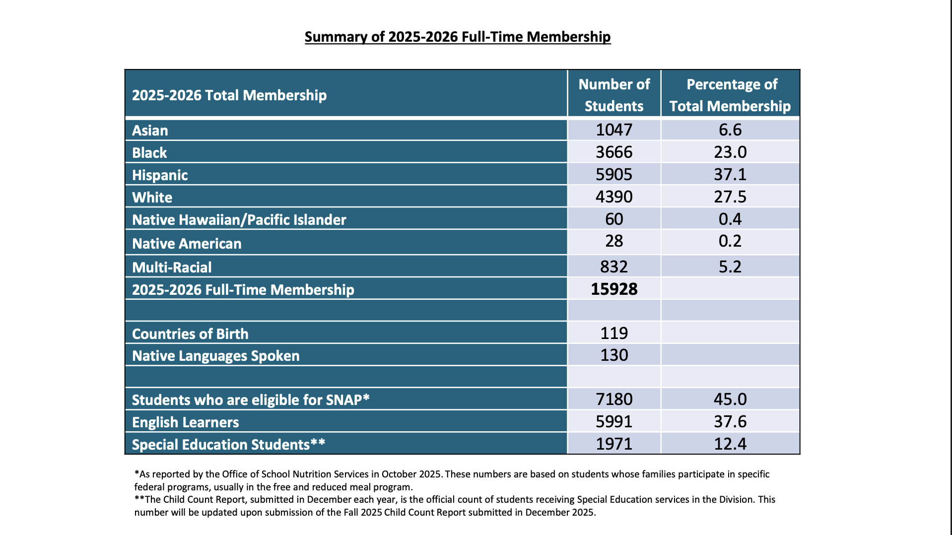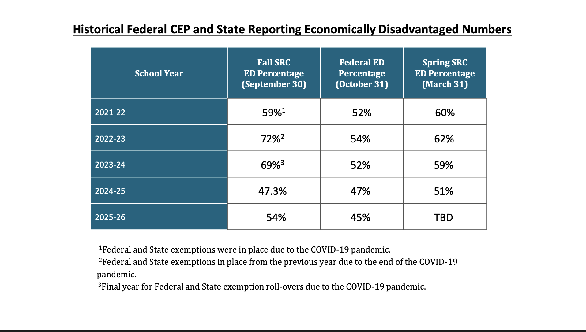 The Fall Student Record Collection showed 54% of students as economically disadvantaged based on September 30 data, which includes families still within a 30-day grace period to submit applications and maintain prior-year eligibility until the federal deadline.