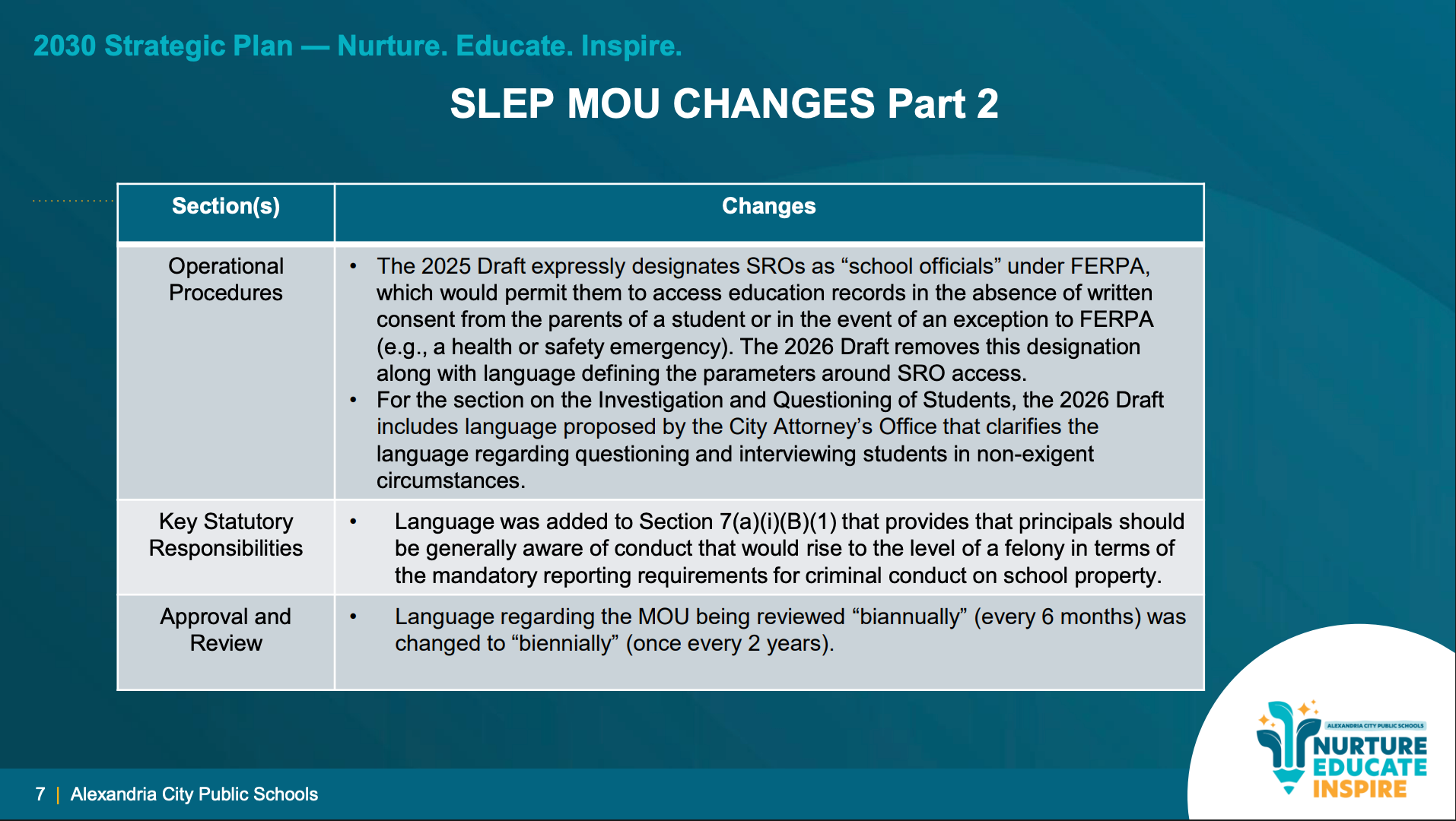 Other changes in the 2026 draft include the removal of all references to the National Association of School Resource Officers, updated statutory citations, new City Attorney language clarifying how SROs may question students in non-emergency situations, and a correction of the review period language from "biannually" — which means every six months — to "biennially," which means every two years, consistent with state law.