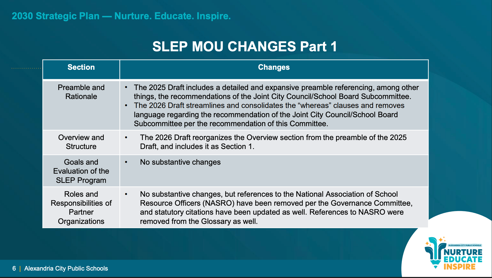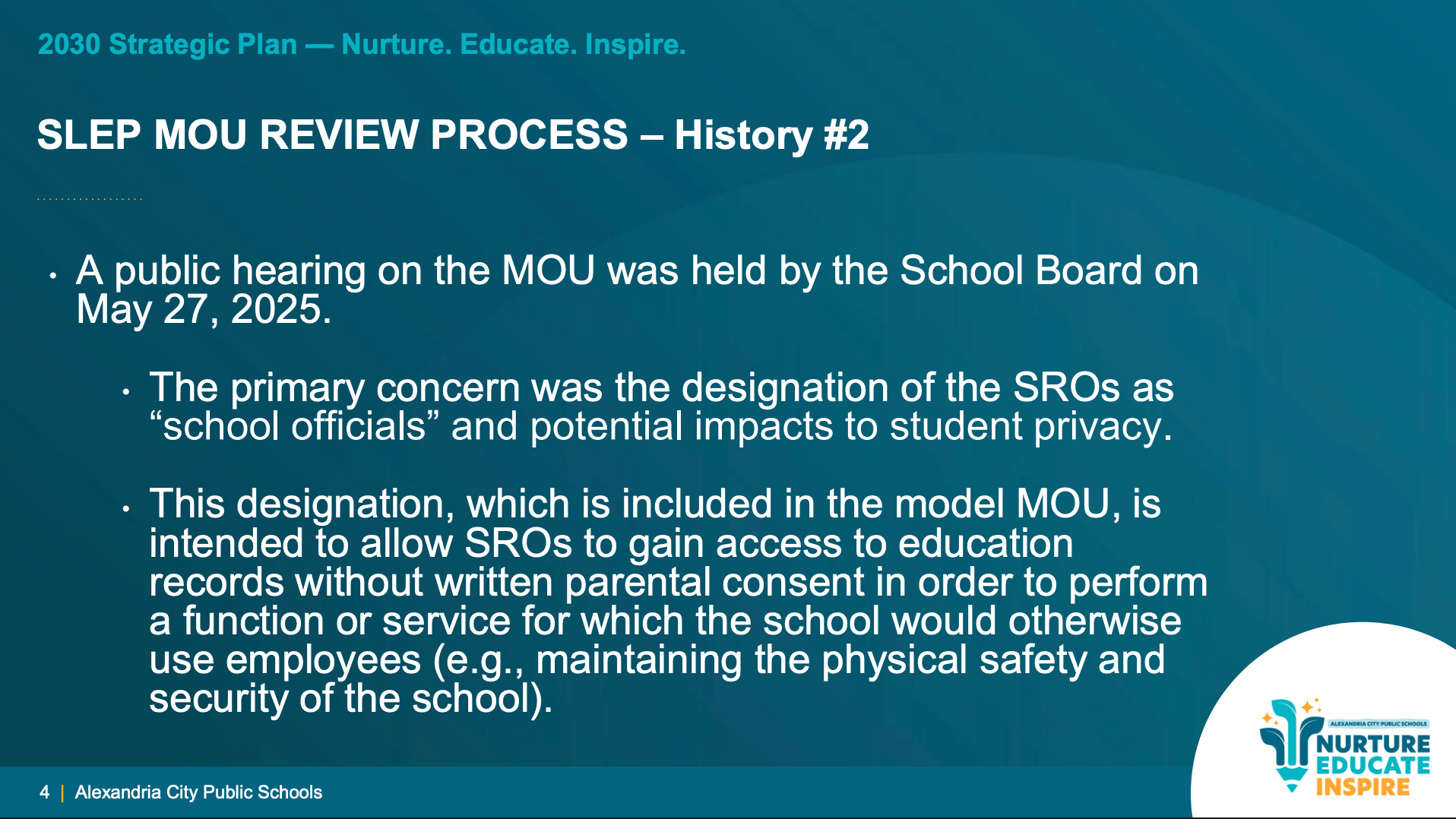The review process stretches back to June 2023, when the current MOU was adopted, and a joint City Council/School Board subcommittee was formed to develop recommendations. That group met five times through March 2024. Its recommendations were incorporated into a 2025 draft, but after the May 2025 public hearing surfaced concerns about student privacy, the board extended the agreement a first time and remanded the draft back to the Governance Committee. A second six-month extension followed in December 2025.