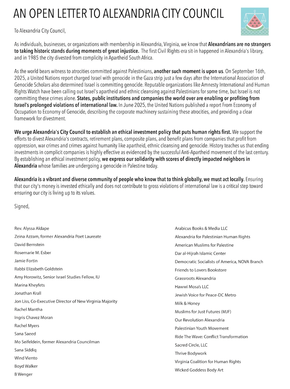 Signatories include former City Councilman Mo Seifeldein, former Alexandria Poet Laureate Zeina Azzam, Rabbi Elizabeth Goldstein, and Jon Liss, co-executive director of New Virginia Majority. Former Al Jazeera producer Sana Saeed also signed.
