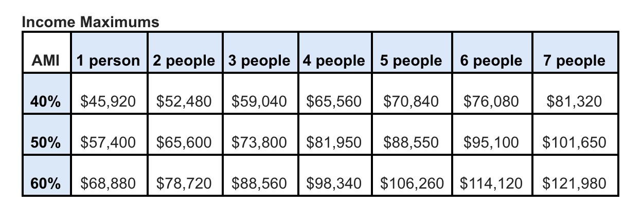 To qualify, a household's total income must fall within set minimums and maximums for each AMI tier. The minimum threshold requires that a household earn at least 2.5 times the monthly rent. Income maximums at 60% AMI range from $68,880 for a single-person household to $121,980 for seven people.