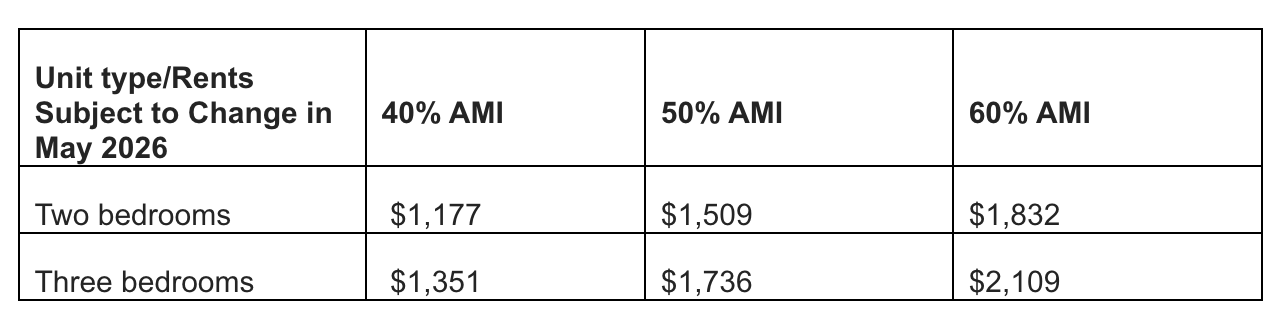 Units at Witter Place are available at three affordability tiers — 40%, 50% and 60% of the area median income — with rents ranging from $1,177 to $2,109 per month depending on unit size and income level. Those rents are subject to increase in May based on federal guidelines. Utilities, including water, sewer and electricity, are not included.