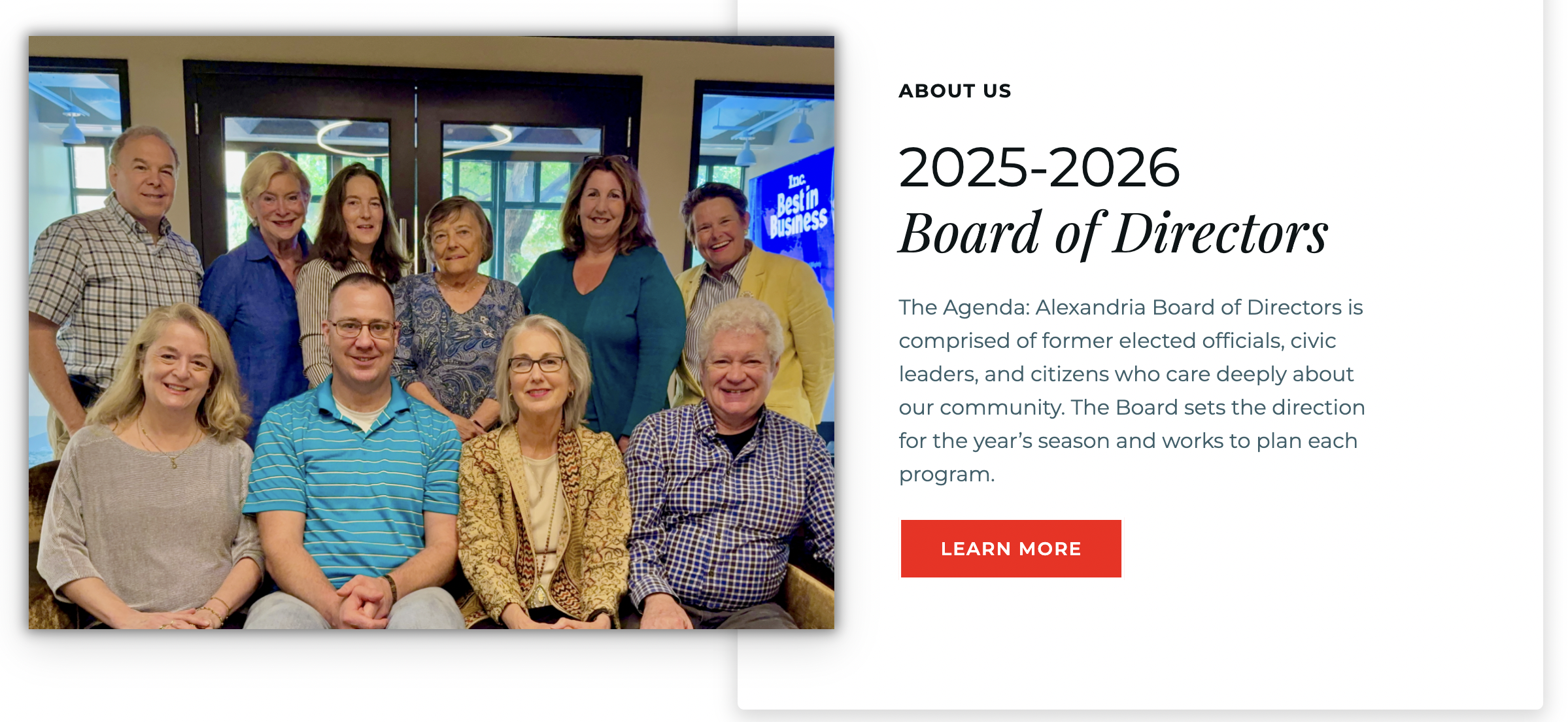 Agenda:Alexandria describes its board of directors on its website as “comprised of former elected officials, civic leaders, and citizens who care deeply about our community.” The board, the website says, “sets the direction for the year’s season and works to plan each program.”