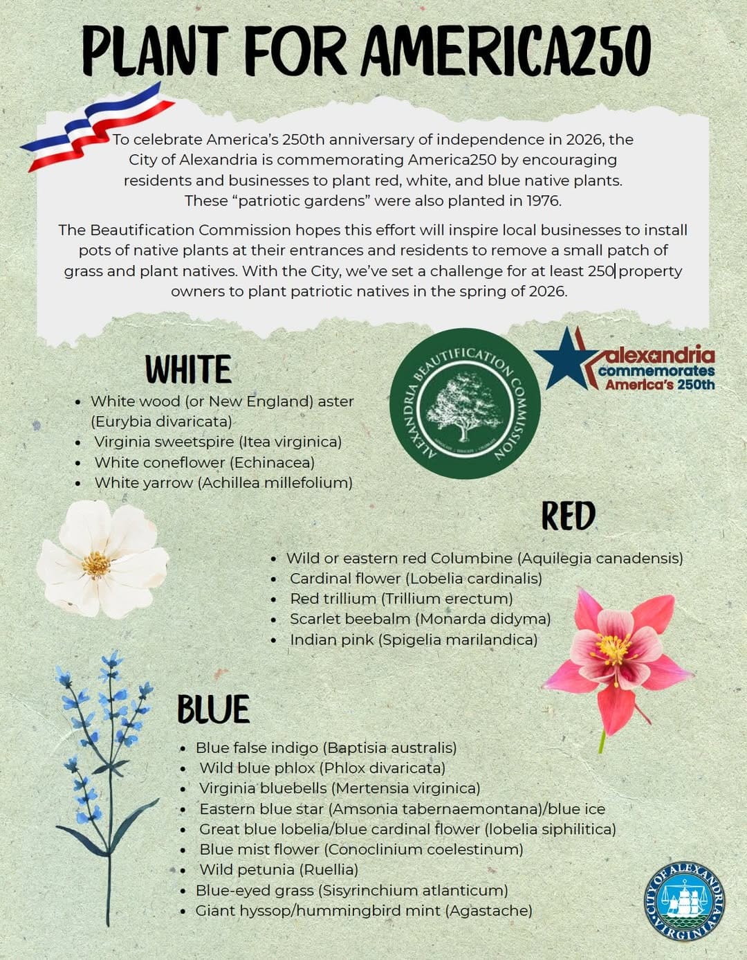 The commission is also adding a special America250 category to the 2026–2027 Alexandria Beautification Awards, recognizing gardens that feature native red, white and blue plantings in honor of the anniversary.