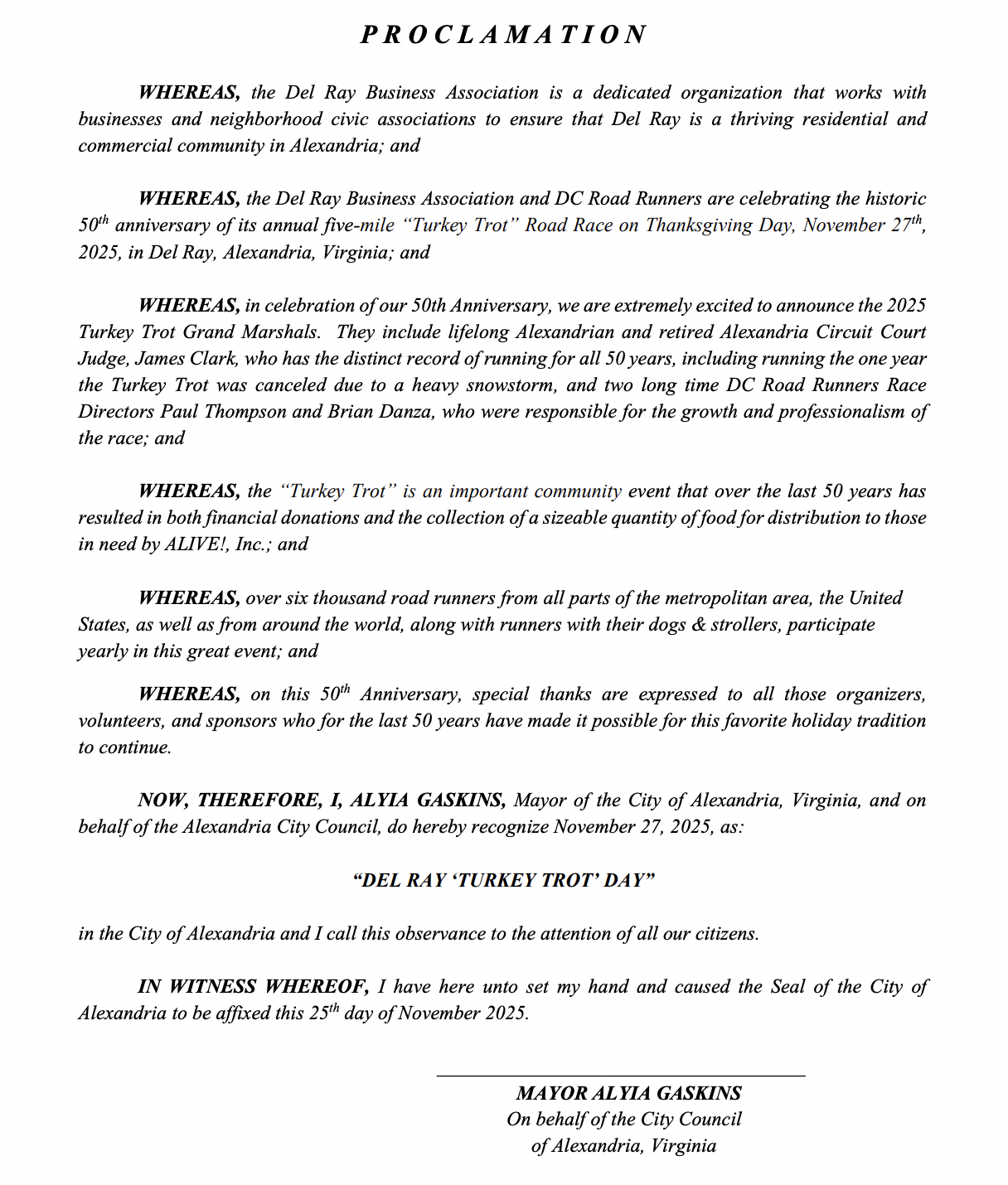 The Alexandria City Council celebrated two beloved holiday traditions Tuesday night, presenting proclamations recognizing the 50th anniversary of the Del Ray Turkey Trot and the 54th anniversary of the Alexandria Scottish Christmas Walk Parade.