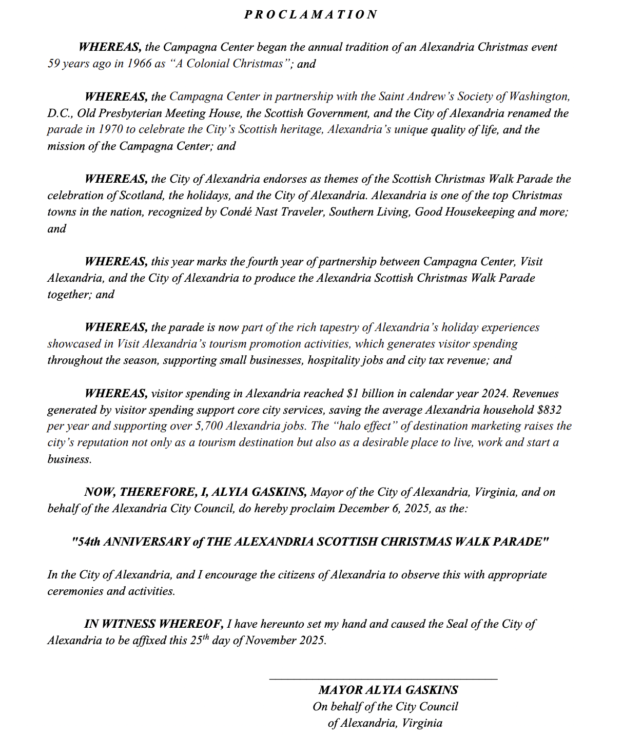 Councilman John Chapman presented a second proclamation marking the 54th anniversary of the Alexandria Scottish Christmas Walk Parade, scheduled for Dec. 6. The event began in 1966 as “A Colonial Christmas” before being renamed in 1970 to honor the city’s Scottish heritage.