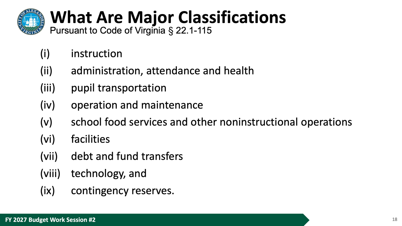 The resolution passed unanimously on a motion by Councilman Elnoubi, seconded by Councilman Chapman. It signals council's intent to require ACPS to submit its operating budget broken down by the nine major spending classifications defined in Virginia law — instruction, administration, transportation, facilities and others — starting with FY 2028. The capital budget is not affected.