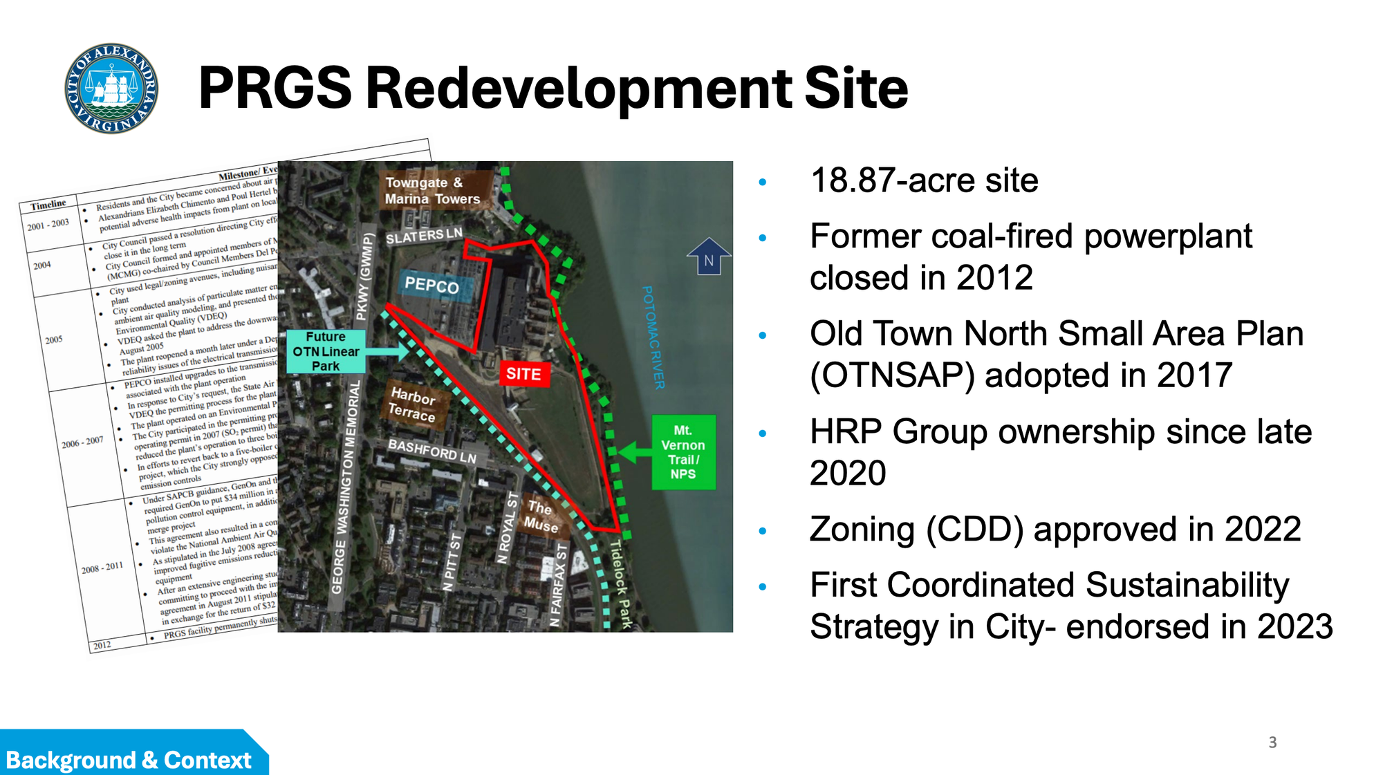 ALEXANDRIA, Va. — The City of Alexandria is considering a request from HRP Group to commit up to $135 million in tax increment financing over roughly 30 years to help redevelop the former Potomac River Generating Station, the 18.87-acre coal-fired power plant site on the Old Town North waterfront that closed in 2012.