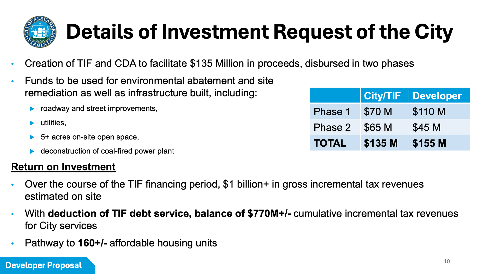 The $135 million would be disbursed in two phases — up to $70 million for Phase I and up to $65 million for Phase II. The developer would carry the larger share of upfront risk, contributing approximately $110 million in Phase I before any city reimbursement and approximately $45 million in Phase II, for a total developer commitment of roughly $155 million in site readiness costs.
