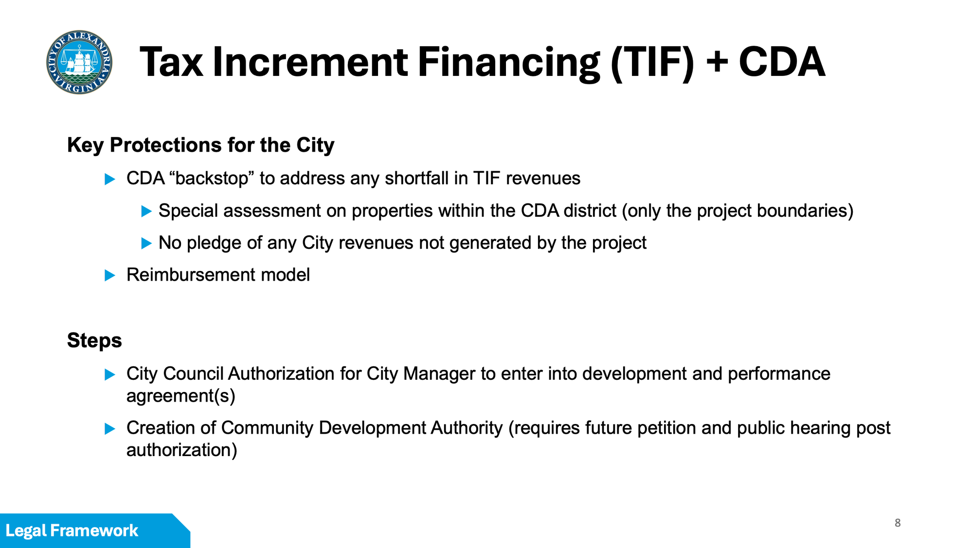 The TIF would draw only from real property tax, sales and use tax, discretionary meals tax and transient lodging tax revenues generated by the project. Excluded are personal property taxes, business tangible taxes, BPOL taxes, utility taxes, real estate transfer taxes, the 1% portion of the meals tax dedicated to affordable housing, and the 3.2 cents of the real estate tax rate reserved for affordable housing and transportation.
