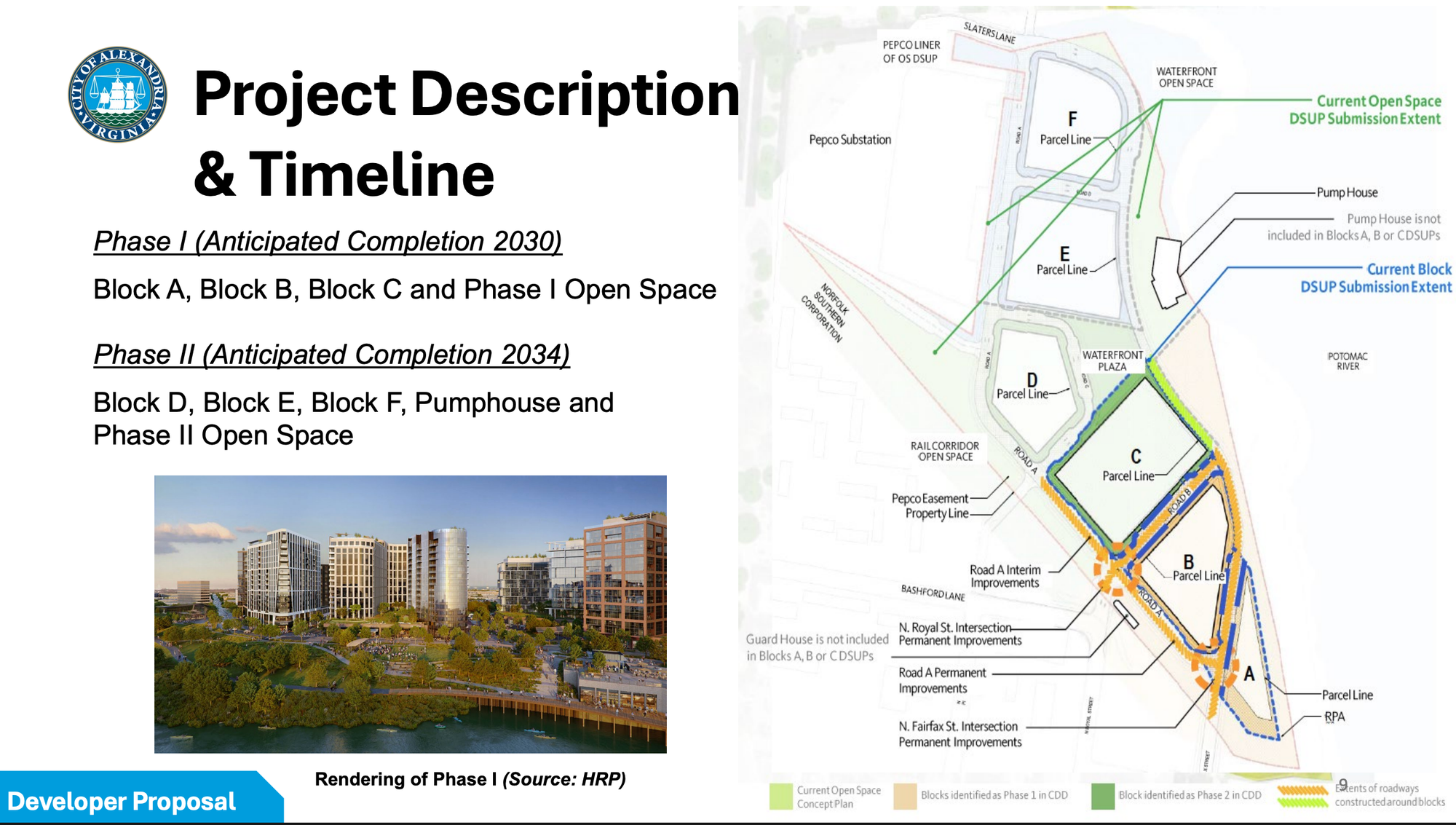 Phase II, anticipated for completion in 2034, includes Blocks D, E, and F, the Pumphouse, and Phase II open space.