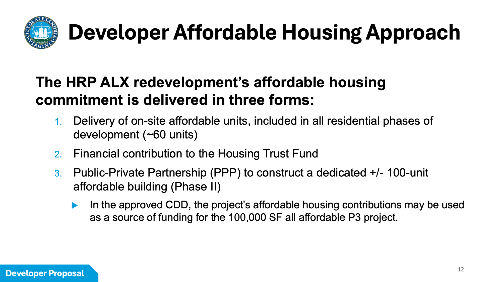 HRP's affordable housing commitment comes in three forms: approximately 60 on-site affordable units distributed across all residential phases, a financial contribution to the city's Housing Trust Fund, and a public-private partnership to construct a dedicated 100-unit affordable building of approximately 100,000 square feet in Phase II — for a total of approximately 160 affordable units.