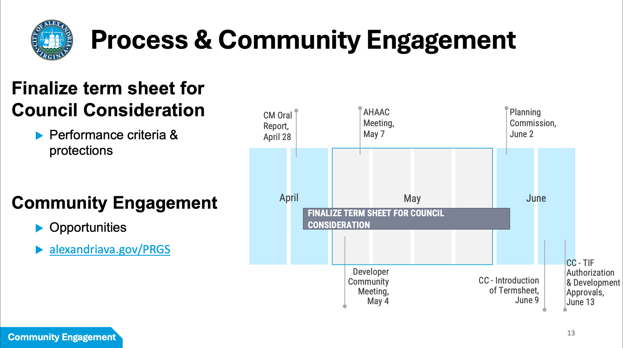 Public comments may be submitted at engage.alexandriava.gov/prgs or by emailing the City Clerk at CouncilComment@alexandriava.gov. The full term sheet outline and project details are at alexandriava.gov/PRGS.