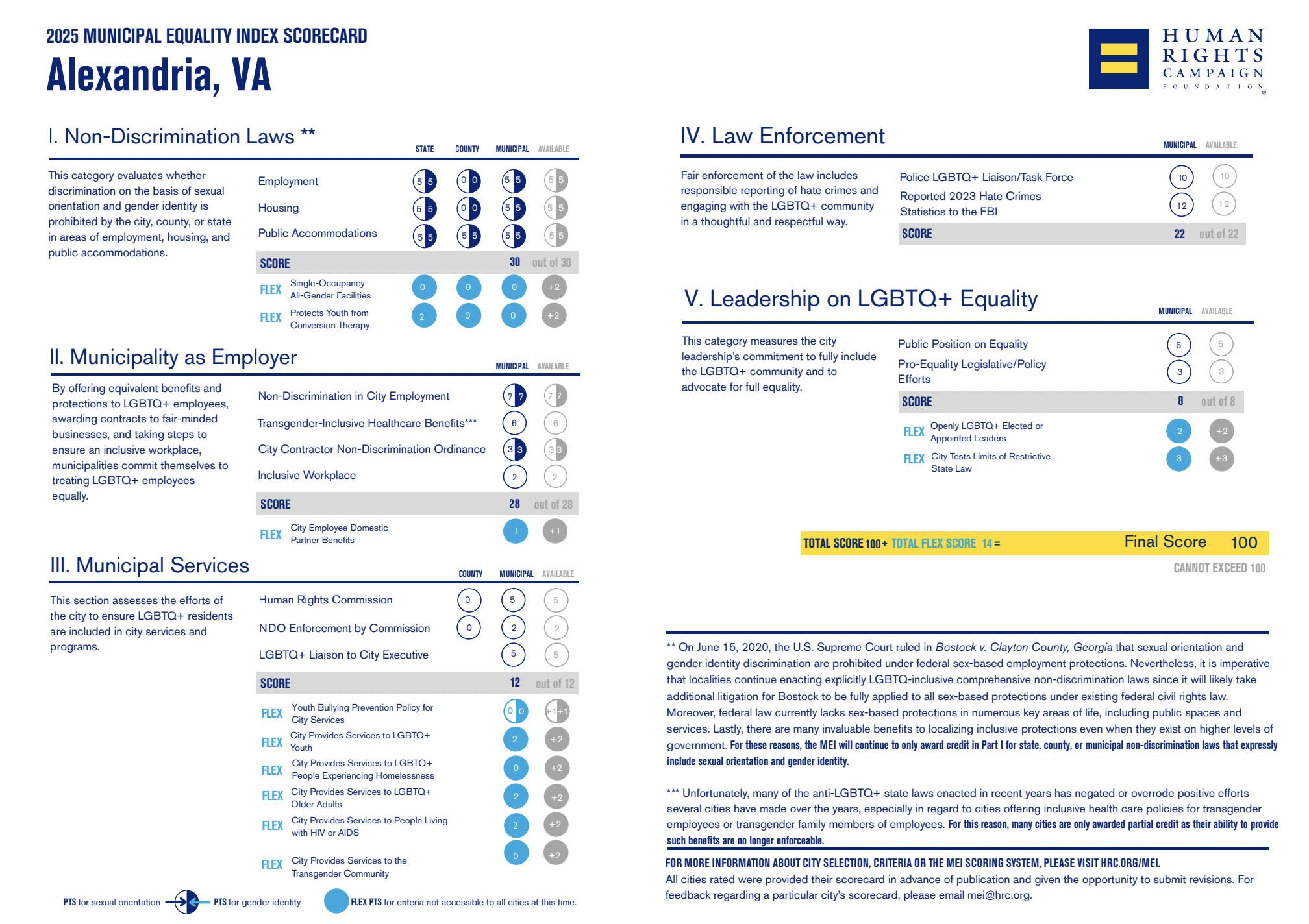 Alexandria earned perfect scores in all five categories, including 30 points for non-discrimination laws, 28 points for municipal services, 22 points for law enforcement, 12 points for leadership and 8 points for municipality as employer.