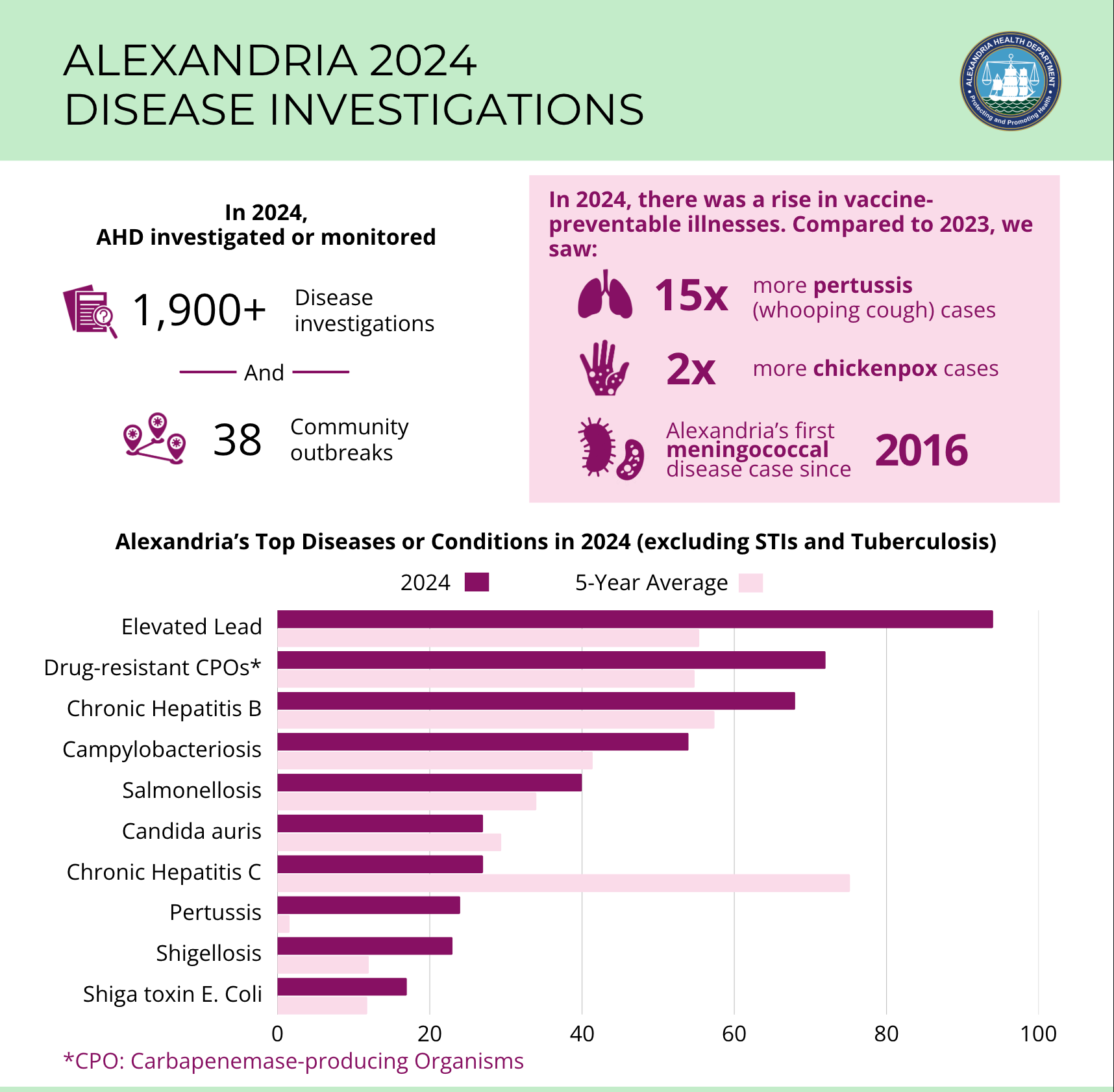 Vaccine-preventable diseases skyrocketed fivefold in Alexandria last year, tuberculosis cases jumped 71%, and HIV infections climbed 24%, according to the Alexandria Health Department's 2024 Disease Investigation Report released today.