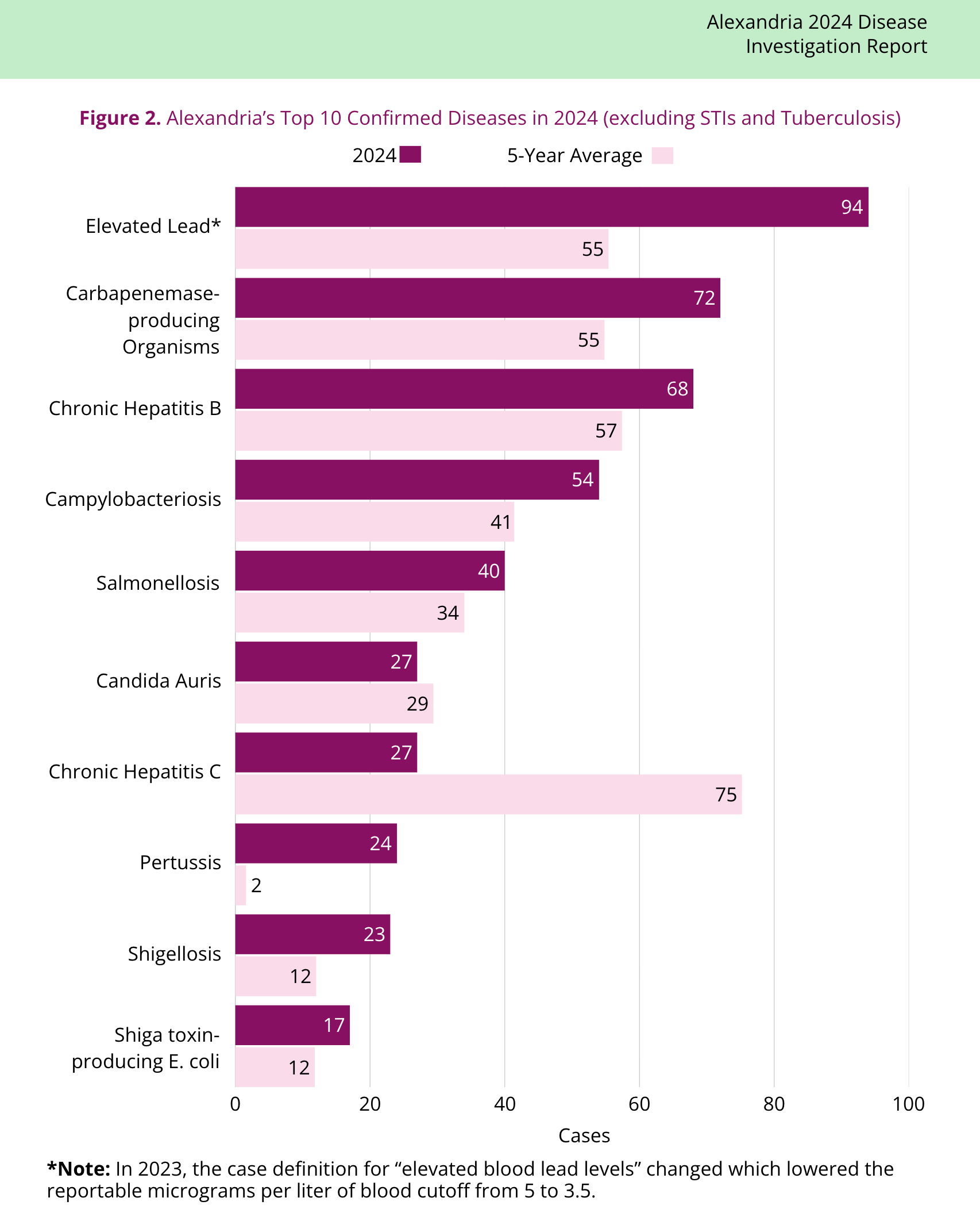 Elevated lead levels were the top-reported condition in the city, with 94 cases — nearly double the five-year average of 55. Officials noted a 2023 change in the national case definition lowered the reportable blood lead threshold from 5 to 3.5 micrograms per deciliter, which affected case counts. Chronic hepatitis B resurged to 68 cases, above its five-year average of 57, making it the third most reported condition. Chronic hepatitis C, by contrast, continued a years-long decline, falling to 27 cases against a five-year average of 75.