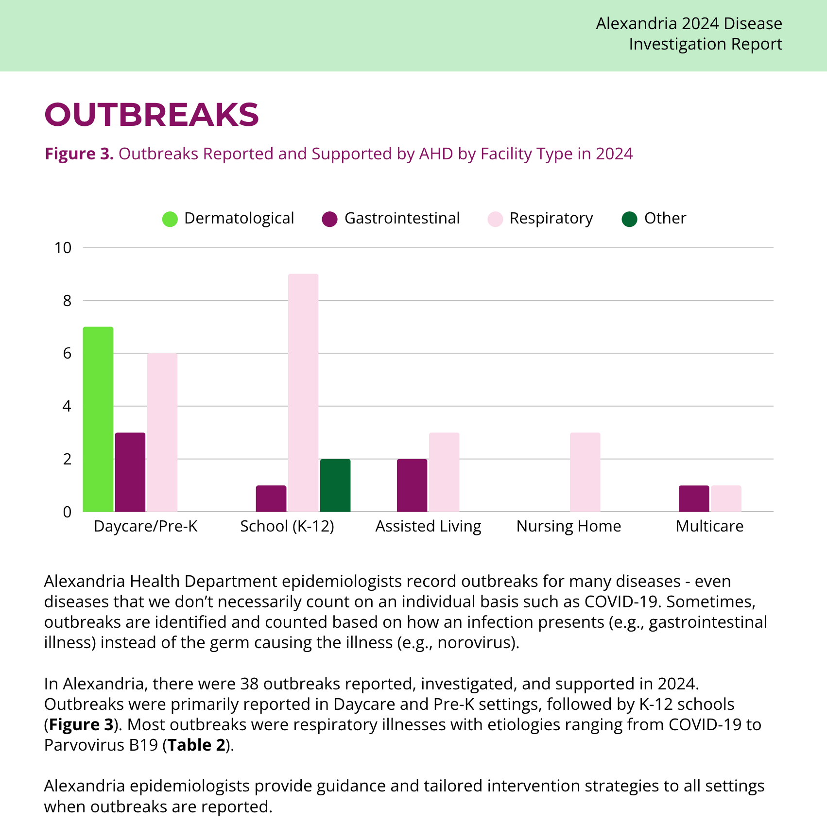 The department conducted more than 1,900 disease investigations in 2024 — a 4% decrease from the prior year — and responded to 38 community outbreaks. Most of those outbreaks were respiratory illnesses, with causes ranging from COVID-19 to Parvovirus B19, and they occurred primarily in daycare and pre-K settings, followed by K-12 schools.