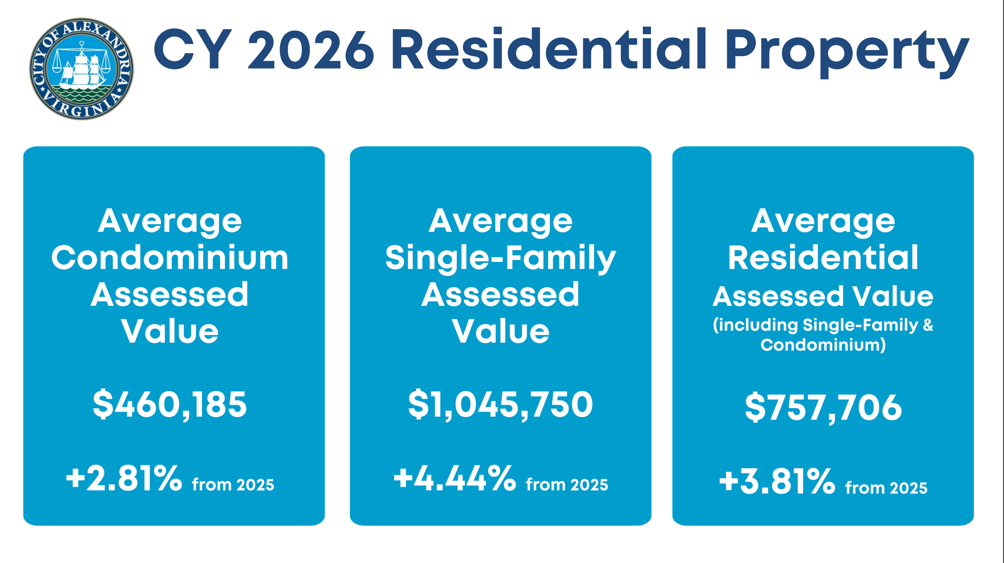 The average Alexandria single-family home is now assessed at $1,045,750, the city announced Tuesday — the second consecutive year the figure has topped $1 million — as the city mailed its calendar year 2026 real property assessment notices and opened the review and appeal process.