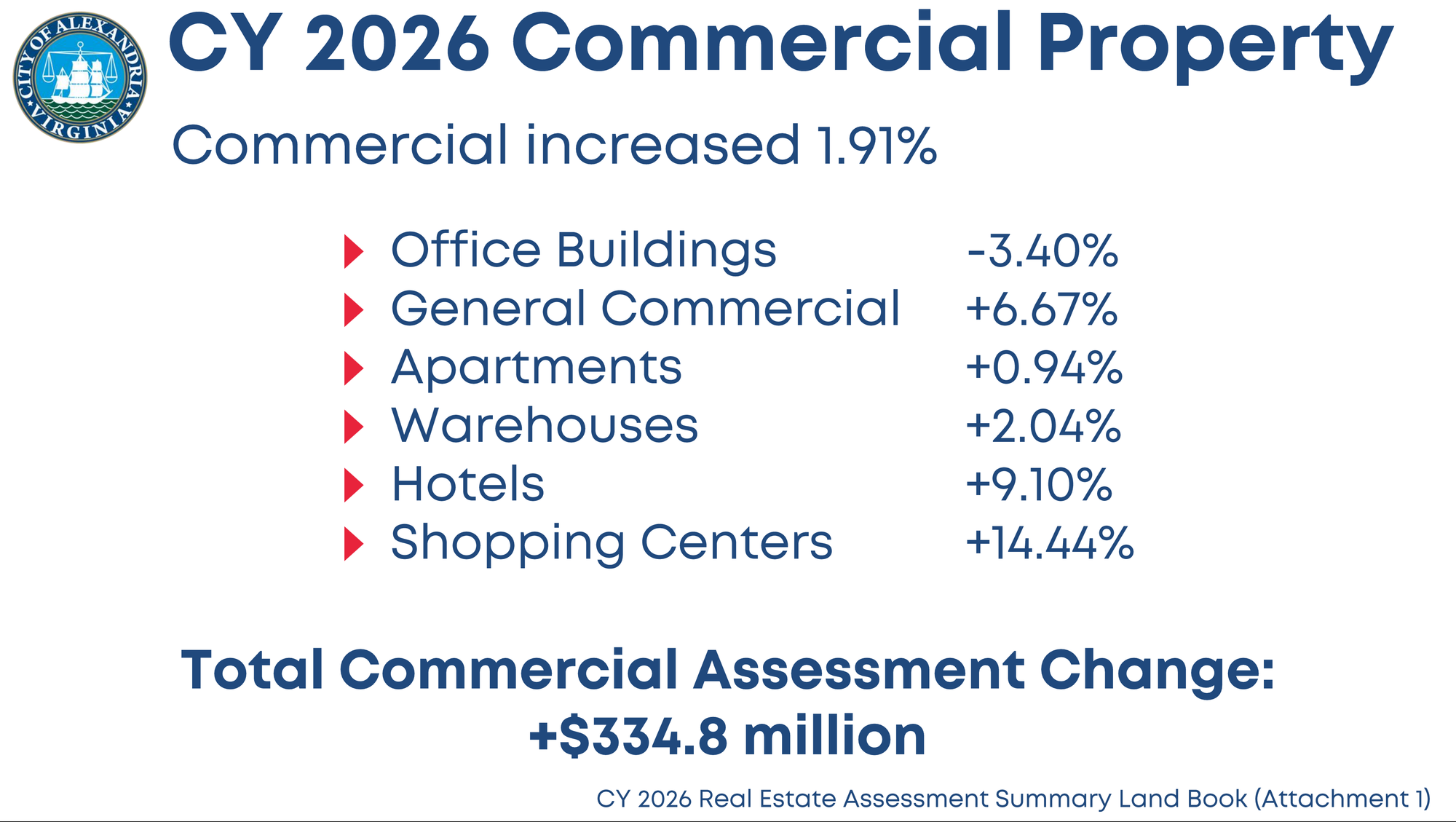 Alexandria's 4.40% residential assessment increase is in line with neighboring jurisdictions, though local home values remain below regional peers. Arlington County saw a 3.2% residential increase with an average assessed value of $882,900; Fairfax County saw a 4.31% increase with an average of $828,895, compared to Alexandria's $757,706 overall residential average. Arlington saw a 1.5% decrease in commercial assessments while Fairfax posted a 1.84% increase.