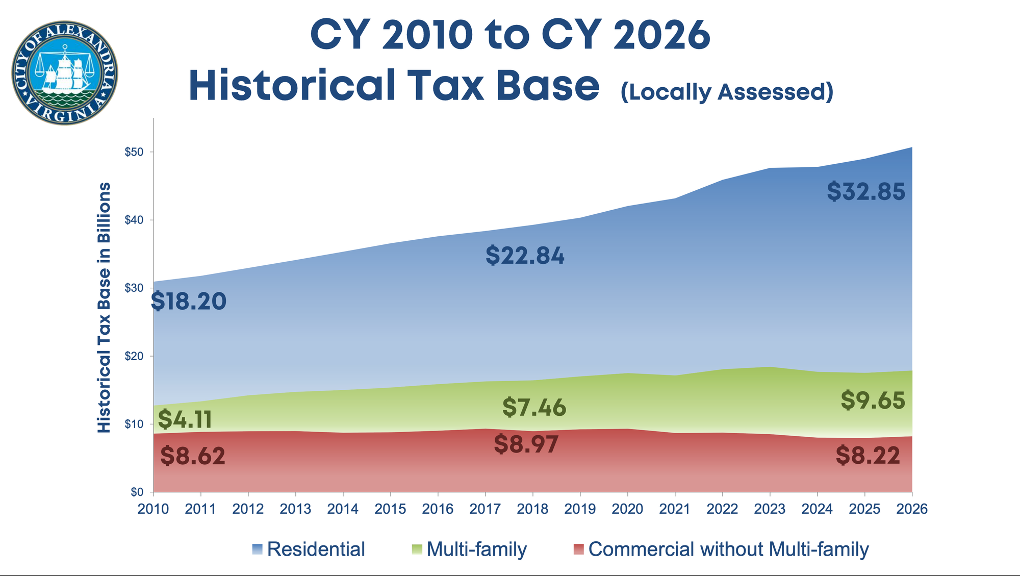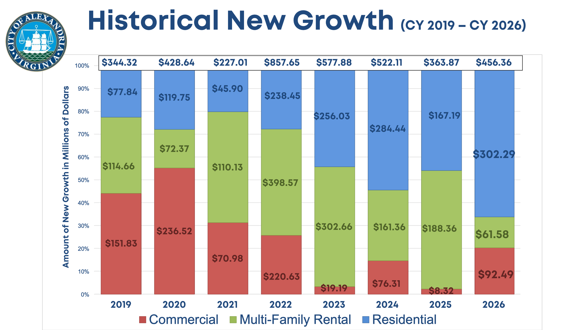 Looking ahead, Milnes highlighted significant development still coming in Potomac Yard — where recent rezoning approvals have already raised the value of vacant land — and around the former Landmark Mall site, now anchored by the planned West End Alexandria mixed-use development and the future Inova hospital campus. Closer to the city center, Housing Alexandria's Sansé and Naja affordable housing project is nearing completion.