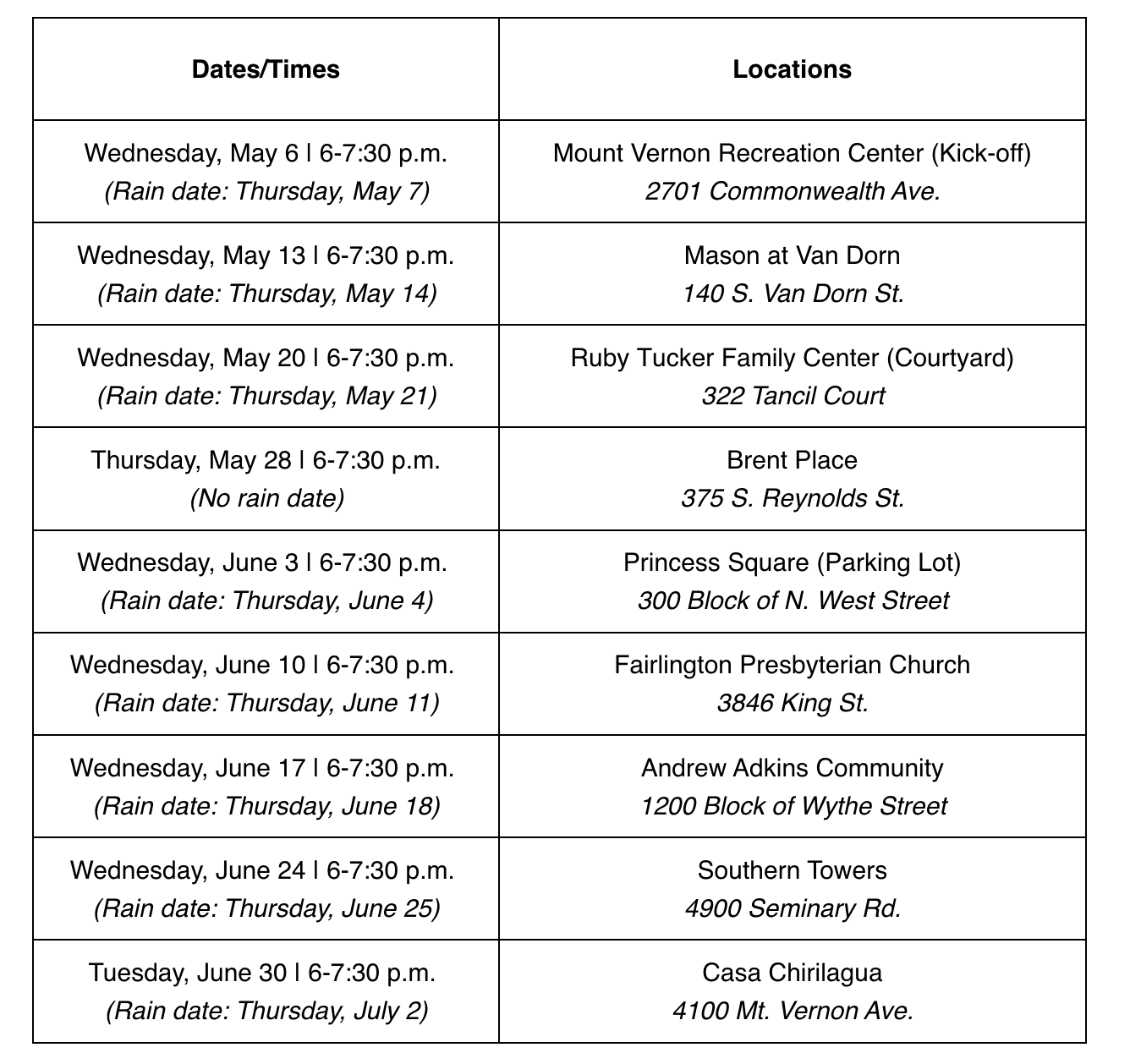 All events run from 6 to 7:30 p.m., with most scheduled for Wednesdays and rain dates the following Thursday when weather is a concern.