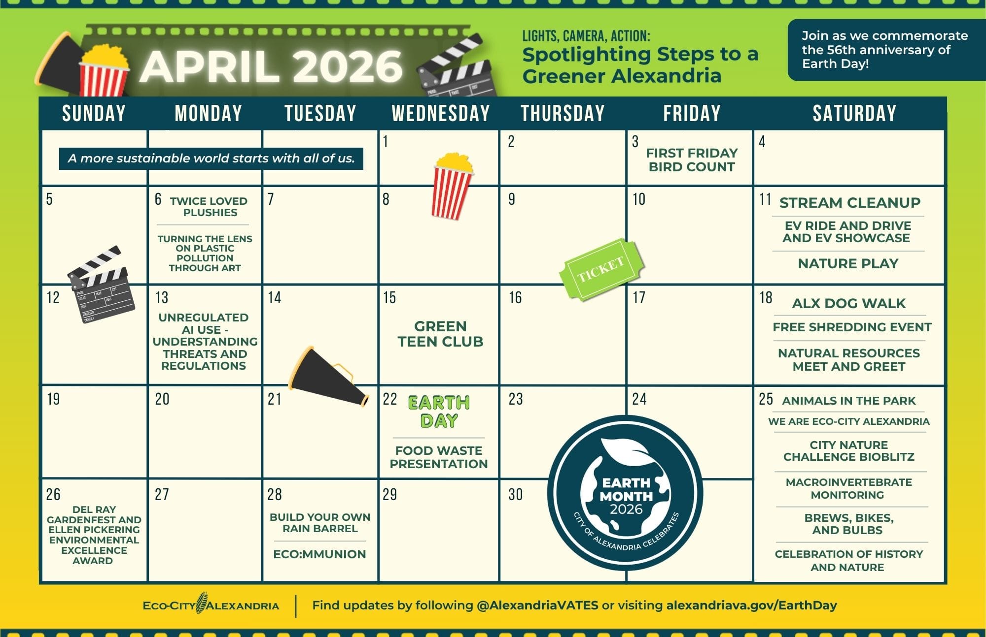 Alexandria is celebrating the 56th anniversary of Earth Day with a month-long series of events, volunteer opportunities and educational programming throughout April under the theme "Lights, Camera, Action: Spotlighting Steps to a Greener Alexandria."