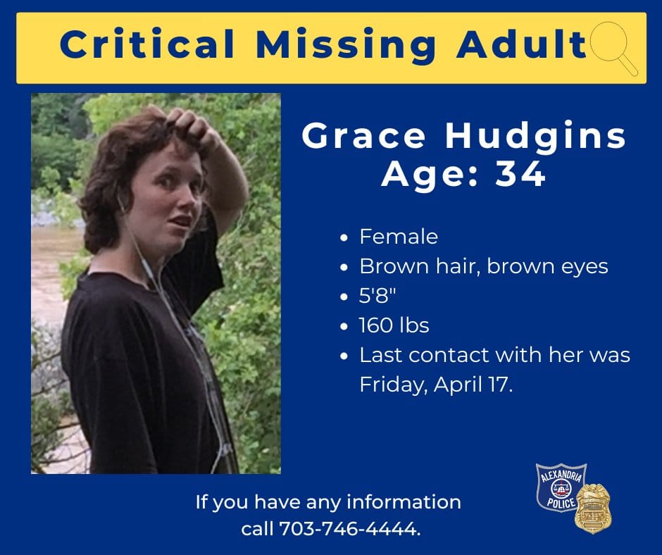 Anyone with information about Hudgins's whereabouts is urged to call 9-1-1 or the APD non-emergency line at 703-746-4444. Tips that help locate missing persons are most valuable in the hours immediately after an alert is issued, and the department is encouraging anyone who may have seen her — even briefly — to come forward.