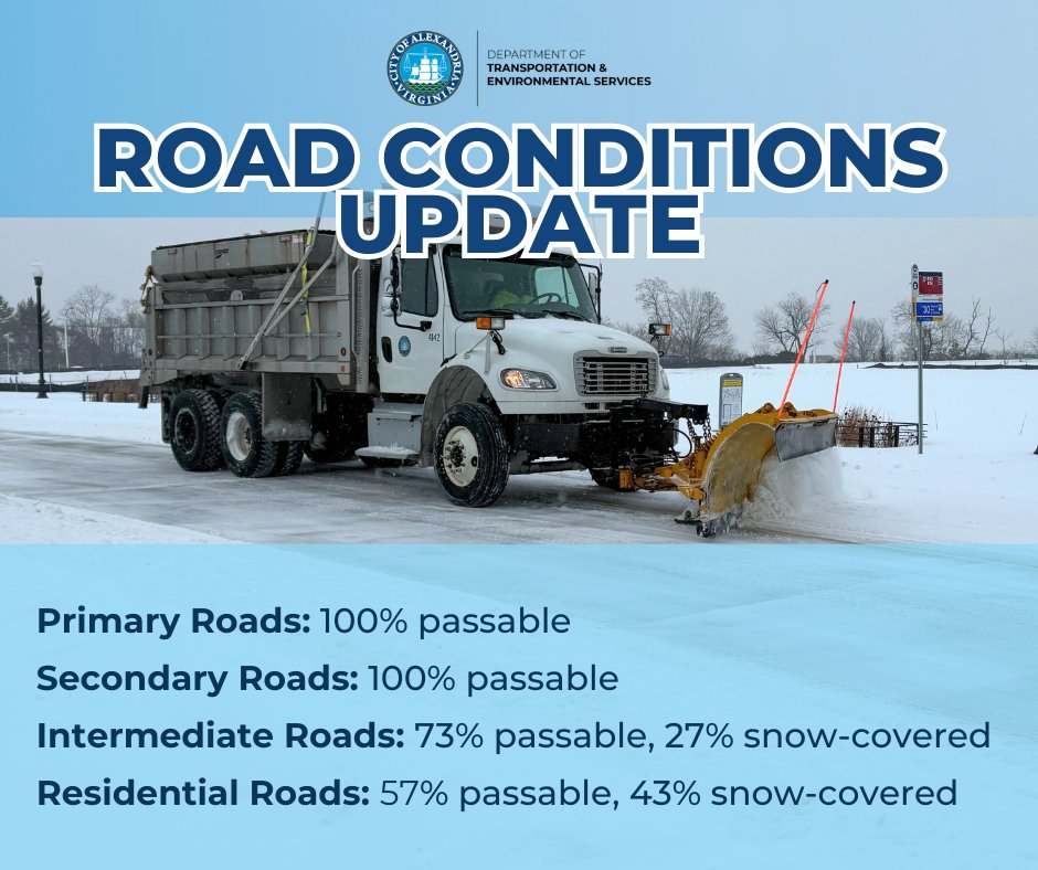 As of noon Wednesday, all primary and secondary roads were fully passable, with intermediate streets at 73% and residential streets at 57%, according to the Department of Transportation and Environmental Services.