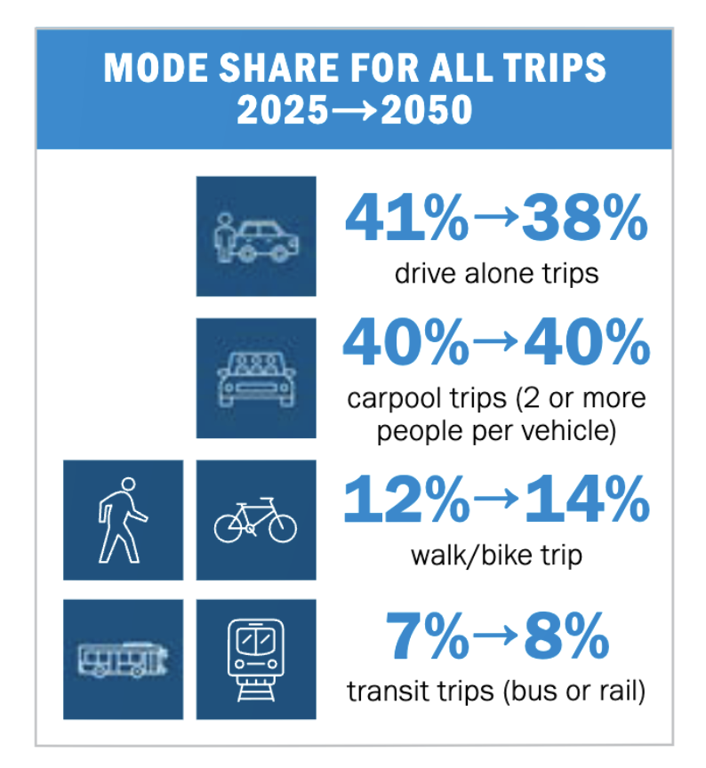 The plan forecasts shifts in how people travel. Walking, biking, and transit trips are expected to increase from 19% to 22% of all trips regionwide by 2050, while drive-alone trips are projected to decline from 41% to 38%. Carpooling is expected to remain steady at about 40% of all trips.