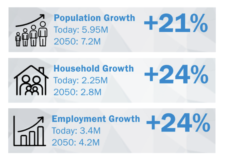 By 2050, more residents and jobs will concentrate near the region’s 145 Regional Activity Centers and within a half-mile of high-capacity transit stations. The number of high-capacity transit stations within activity centers is projected to increase from 148 to 246.