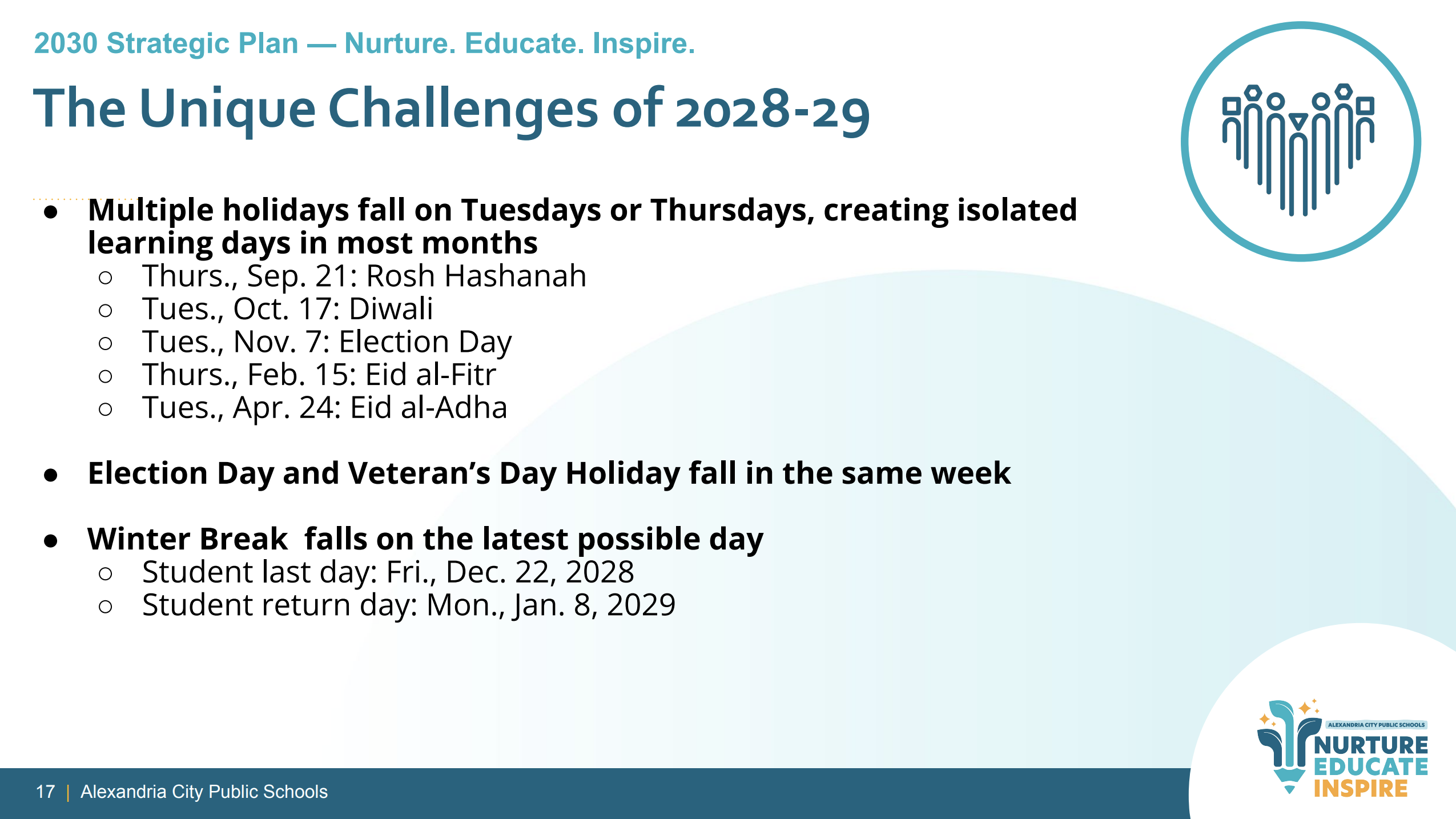 In their presentation materials, staff previewed challenges for the 2028-29 calendar, which has not yet been finalized.