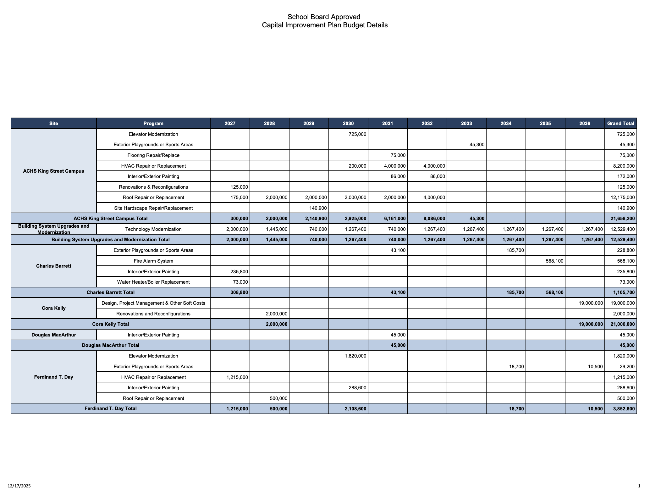 The plan comes in under City Manager James Parajon’s $285.8 million spending guidance, a significant reduction from Superintendent Melanie Kay-Wyatt’s original $340.4 million proposal in November, which included $105 million for the Cora Kelly modernization beginning in 2028.