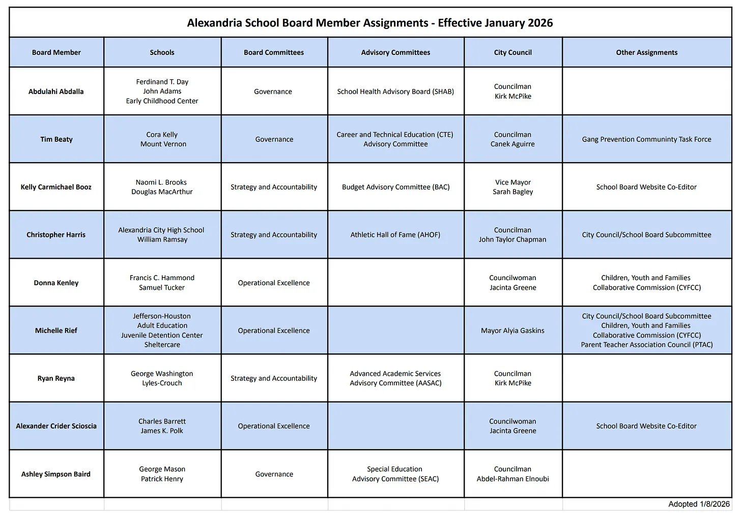 The Alexandria City School Board conducted routine business at its first meeting of 2026, Thursday evening, approving committee assignments and consent calendar items while hearing from community members on topics ranging from disability accommodations to staffing concerns.