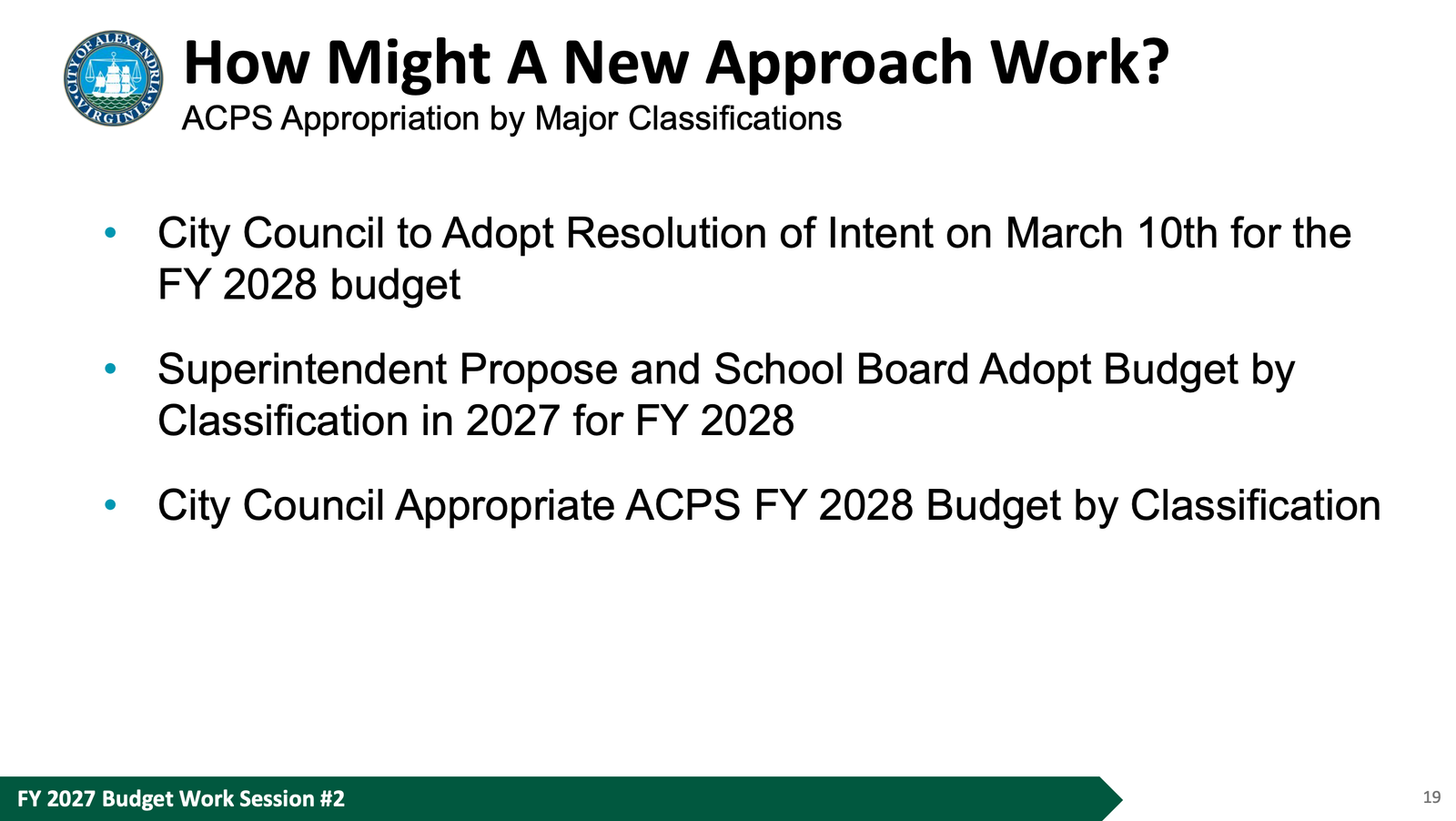 Gaskins framed the classification proposal as a transparency measure. "If someone says, well, council, you need to fund collective bargaining, well, there's a way that the category can say collective bargaining," she said at the session. "And you would see either we're funding it or we're not funding it." City staff noted that Virginia law explicitly permits — alongside the traditional lump-sum method — appropriation by major classifications, including instruction, transportation, facilities, and technology.