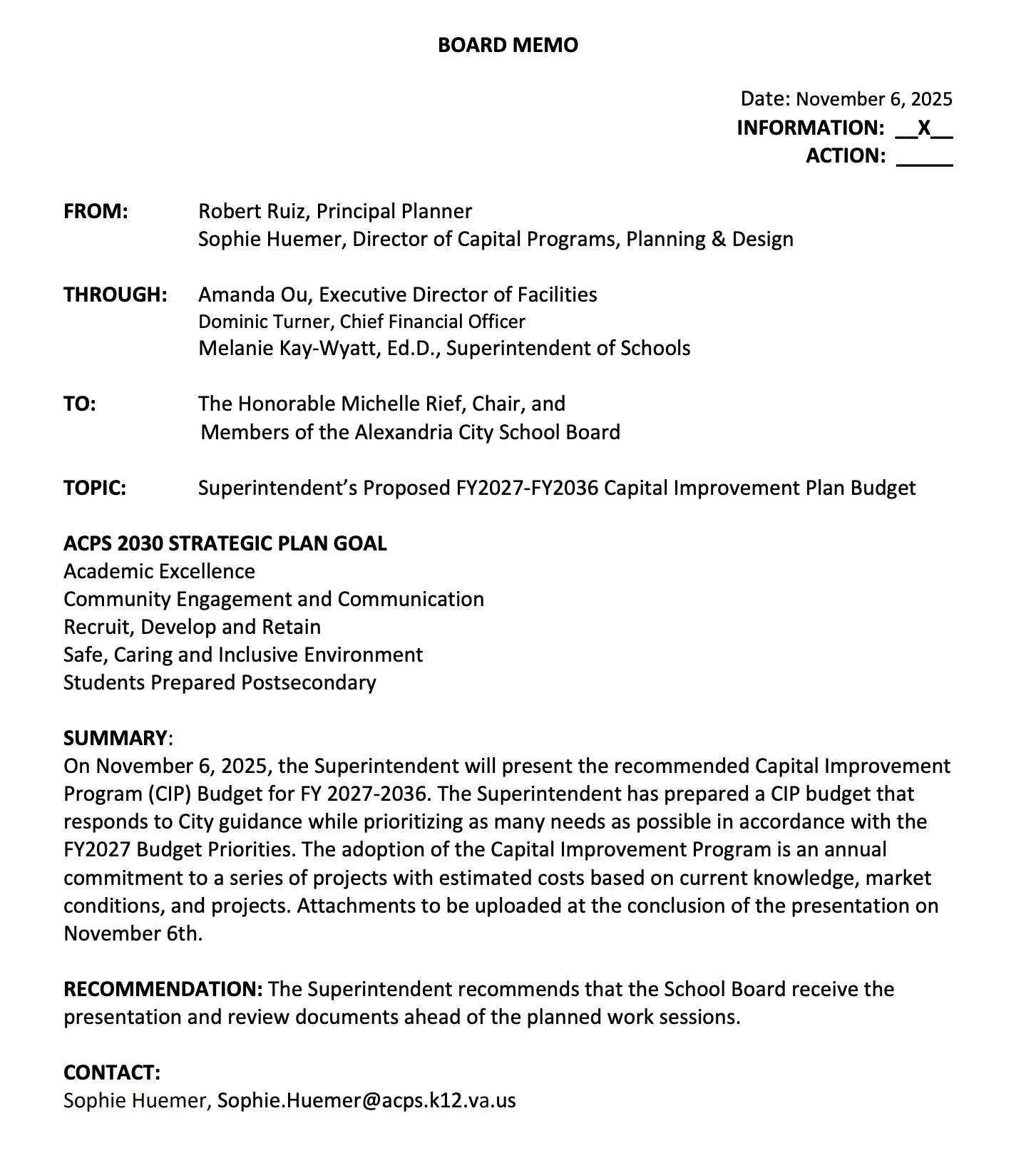 According to a memo from Principal Planner Robert Ruiz and Director of Capital Programs Sophie Huemer, the superintendent has prepared a capital improvement program budget “that responds to City guidance while prioritizing as many needs as possible in accordance with the FY2027 Budget Priorities.”