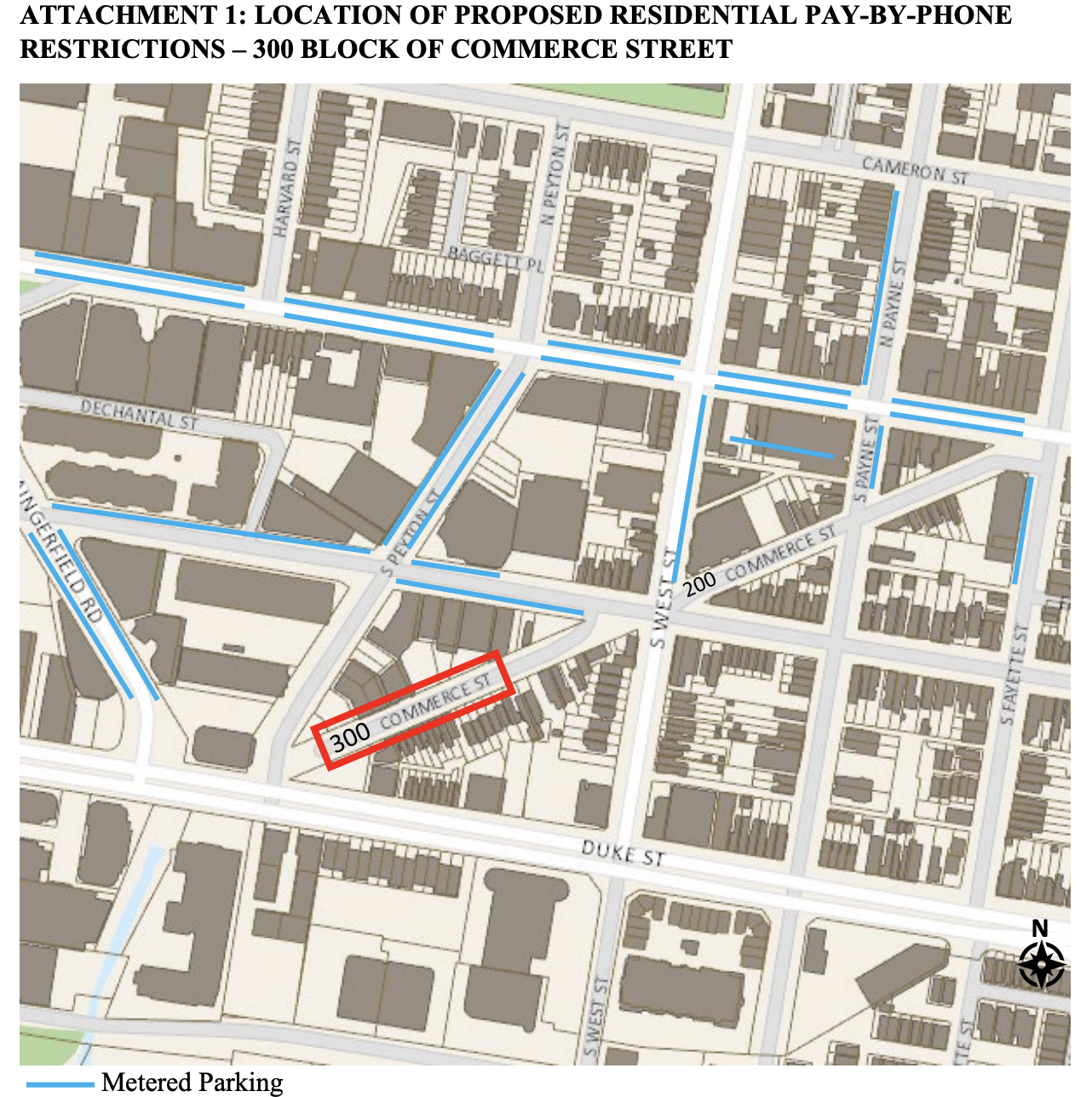 Residents of the 300 block of Commerce Street, one block from King Street, are seeking approval to add residential pay-by-phone parking restrictions to their block. A petition signed by 52% of households on the block — the minimum threshold — cleared the first hurdle, and a city parking survey found 88% occupancy at the time of the count, well above the 75% required. Staff is recommending approval.