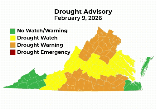DEQ said it is working with local governments, public water works, and large water users to ensure drought response plans and ordinances are followed. The agency urged all Virginians to cut back water use, monitor conditions, and repair leaks.