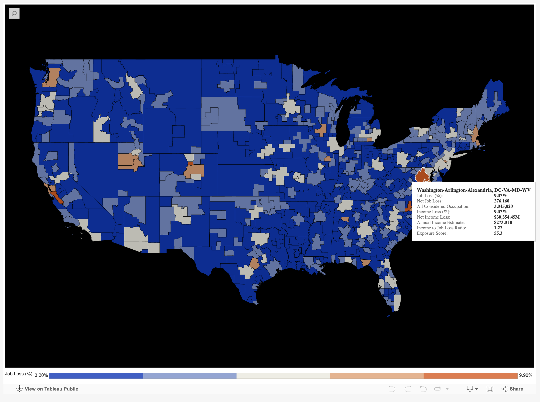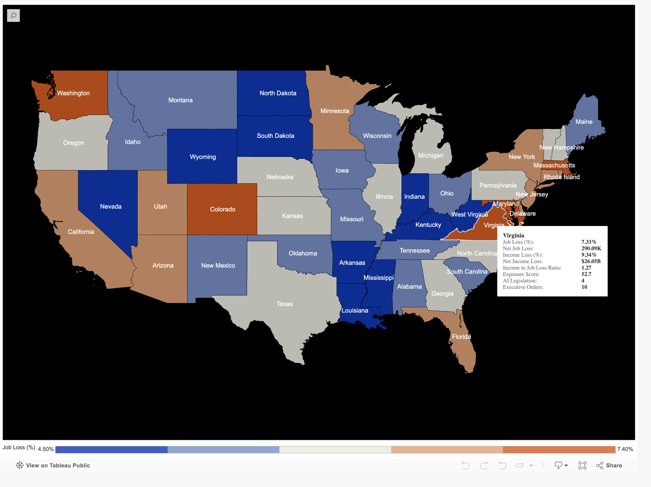 At the state level, Virginia faces a 7.33% projected AI job loss rate and $26.05 billion in net income loss — ranking among the six most vulnerable jurisdictions in the country alongside the District of Columbia, Massachusetts, Maryland, Washington state, and Colorado. Virginia's income-to-job-loss ratio of 1.27 indicates that the positions most at risk are disproportionately higher-paying ones, compounding the budget pressure on a city that draws more than 60% of its operating revenue from property taxes.