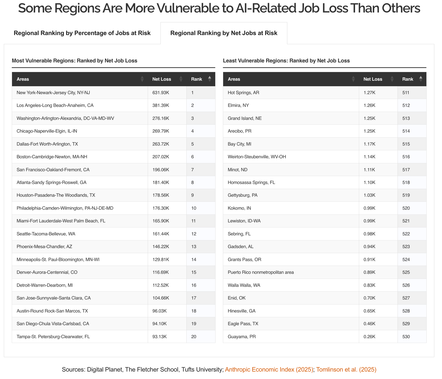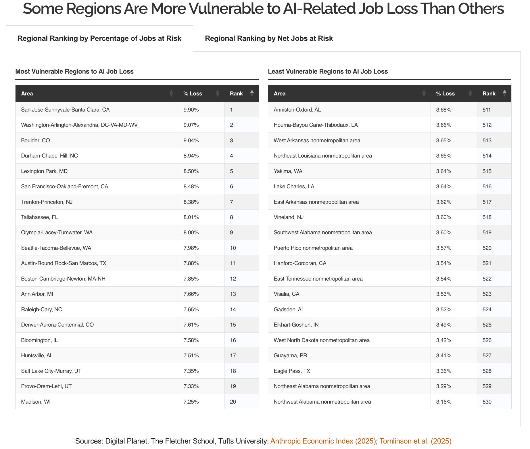 The Washington-Arlington-Alexandria metro ranks second in the country for AI-related job vulnerability, behind only San Jose, according to the American AI Jobs Risk Index released this week by the Digital Planet research program at Tufts University's Fletcher School. The metro faces a projected 9.07% job loss rate across a workforce of more than 3 million positions — translating to an estimated 276,160 jobs at risk and $30.4 billion in annual household income potentially lost to artificial intelligence over the next two to five years.