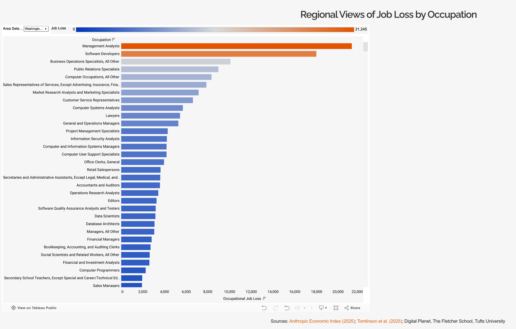 When researchers filtered the Tufts occupation-level data specifically to the Washington metro, management analysts topped the list of projected AI-driven job losses by a significant margin, with software developers close behind. Also among the most exposed: business operations specialists, public relations specialists, market research analysts, customer service representatives, computer systems analysts, lawyers, and operations research analysts.
