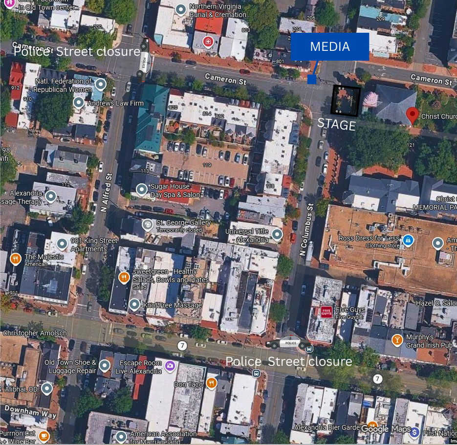 Rolling street closures along the route are expected between approximately 9 a.m. and 2 p.m. To support the peace talk at Christ Church, Cameron Street between Washington Street and Alfred Street and Columbus Street between King Street and Queen Street will be closed beginning at approximately 6:15 a.m. through 2 p.m. Vehicle access in affected areas will be limited during that window.