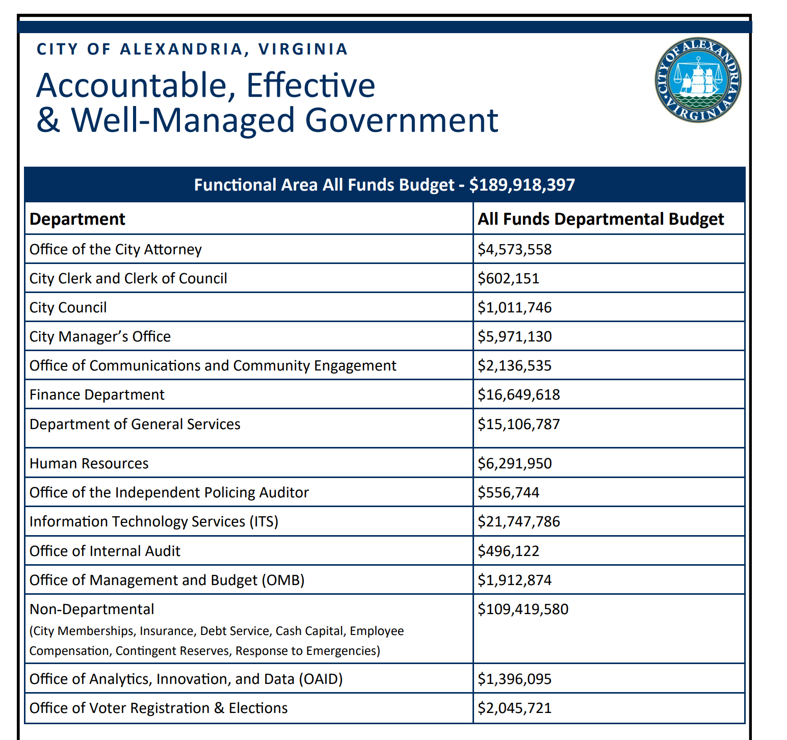 The Office of Communications and Community Engagement sees the steepest percentage budget reduction in the functional area — down 18.8% from $2,631,656 to $2,136,535 — losing 3.0 FTEs and dropping from 17 to 14. The largest driver is the transfer of two positions back to the Alexandria Police Department: a Public Safety Information Officer and a Communications Manager, totaling $307,700. An additional Community Engagement Specialist position is eliminated, and partial-year freezes apply to a vacant Communications Manager and a second vacant Community Engagement Specialist.