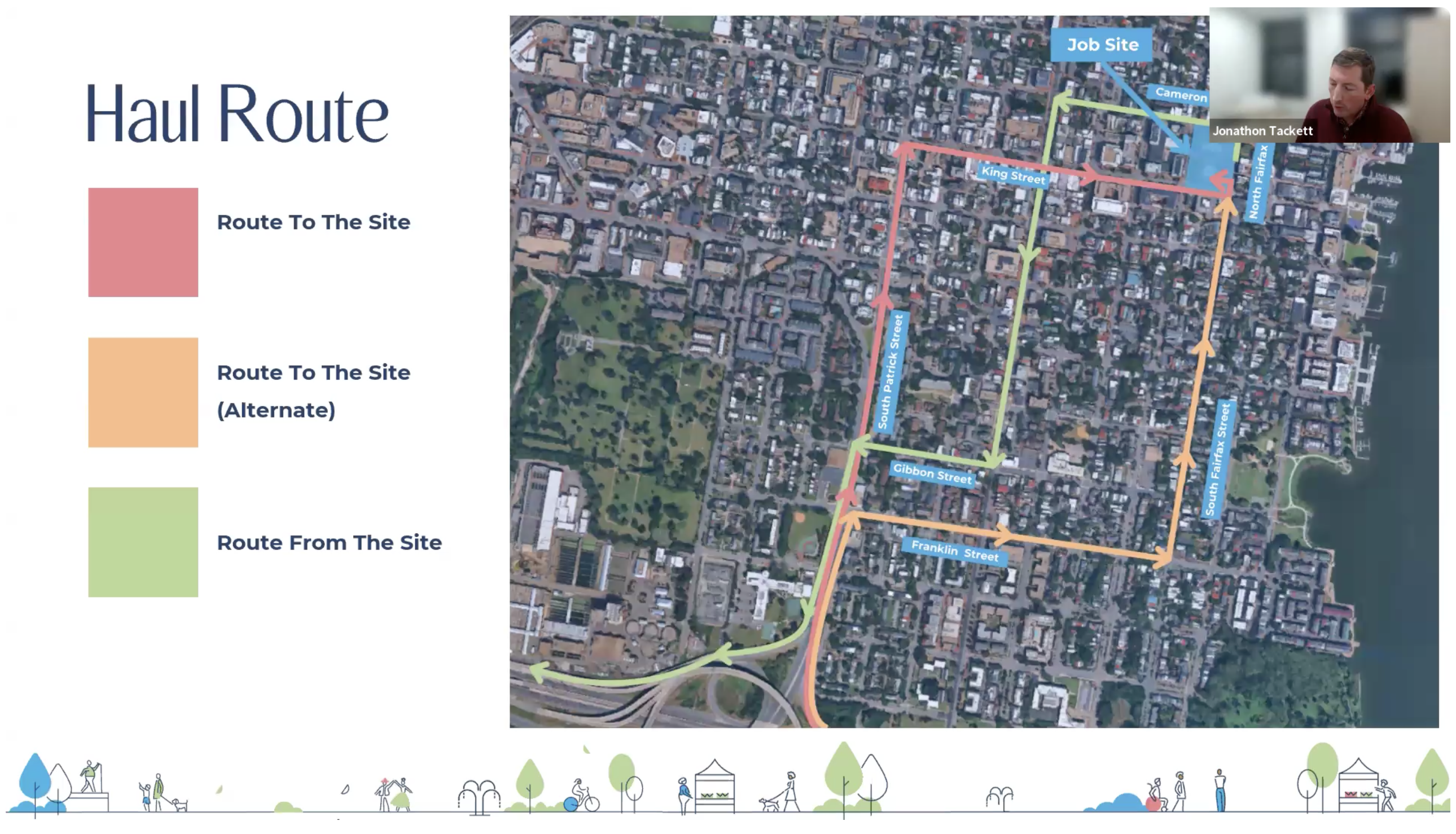 Fairfax Street will serve as the primary access point for construction materials and debris removal, creating the busiest area for vehicle traffic. Construction trucks will follow a designated haul route from Interstate 495 via Route 1 to King Street, entering the site on Fairfax and exiting via Cameron Street to Washington Street.