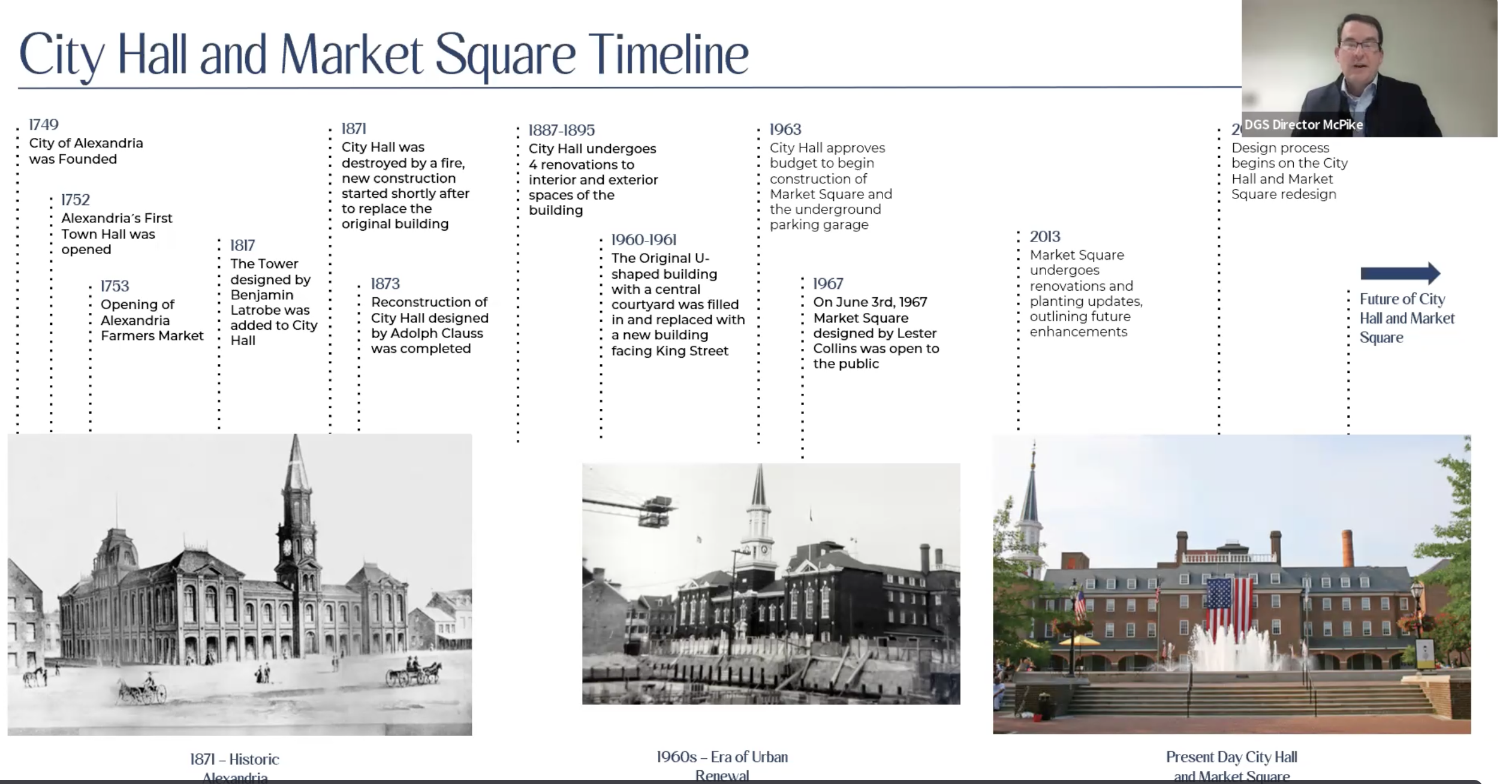 Market Square has been the center of civic activity for Alexandrians since the city’s founding in 1749, according to the city. The current City Hall, listed on the National Register of Historic Places, was reconstructed by architect Adolph Cluss after a fire destroyed the building in 1871. The bell tower, designed by Benjamin Latrobe, was added in 1817 and has been undergoing structural monitoring as part of urgent repairs that began in 2014.