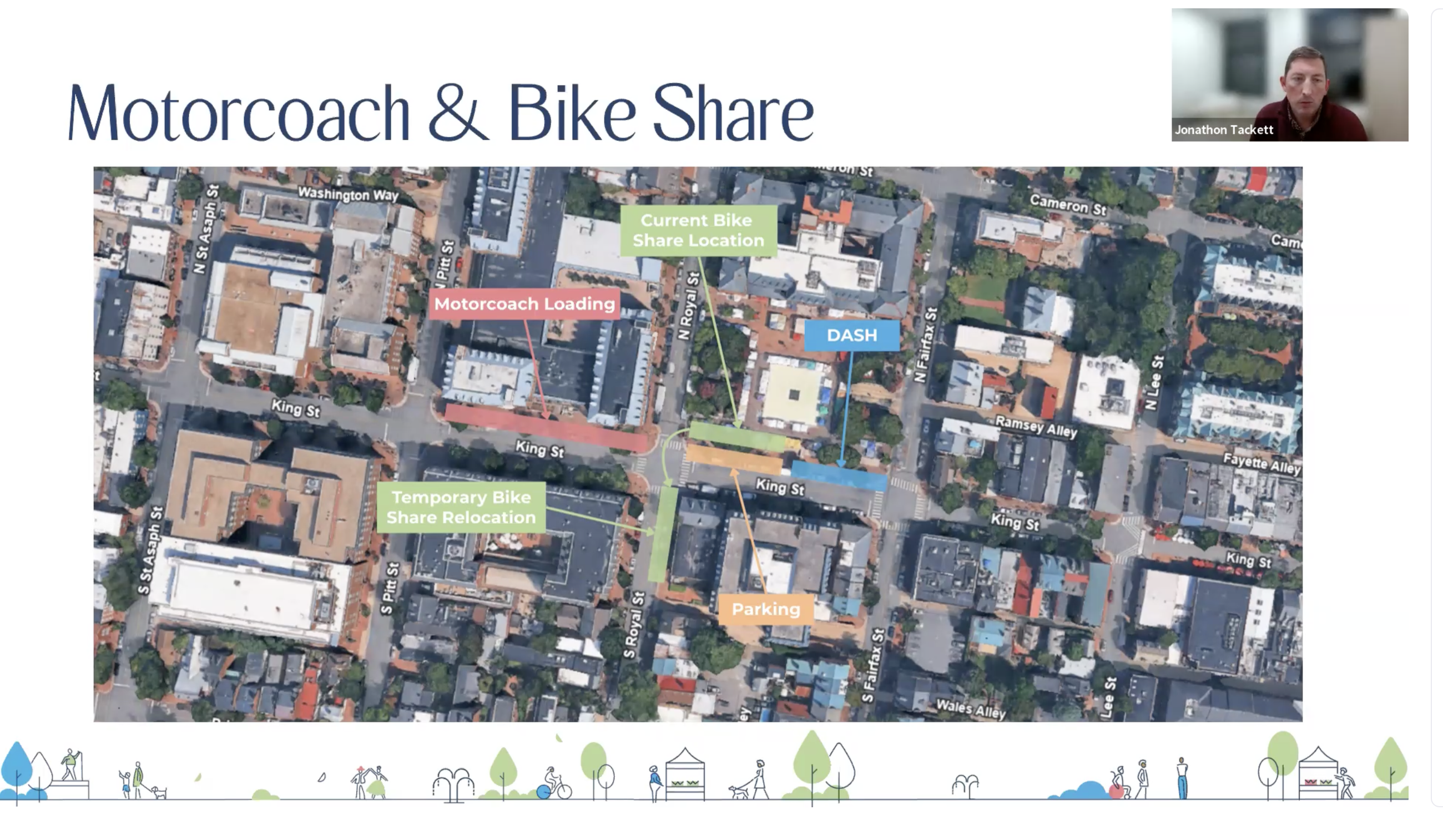 Bus transportation will be affected, with DASH bus routes 30, 31, and 34, along with the King Street trolley, combining their current two stops into a single location on King Street for most of the construction period. Motor coach parking and unloading will move from King Street to the 400 block of King Street in front of Tavern Square.