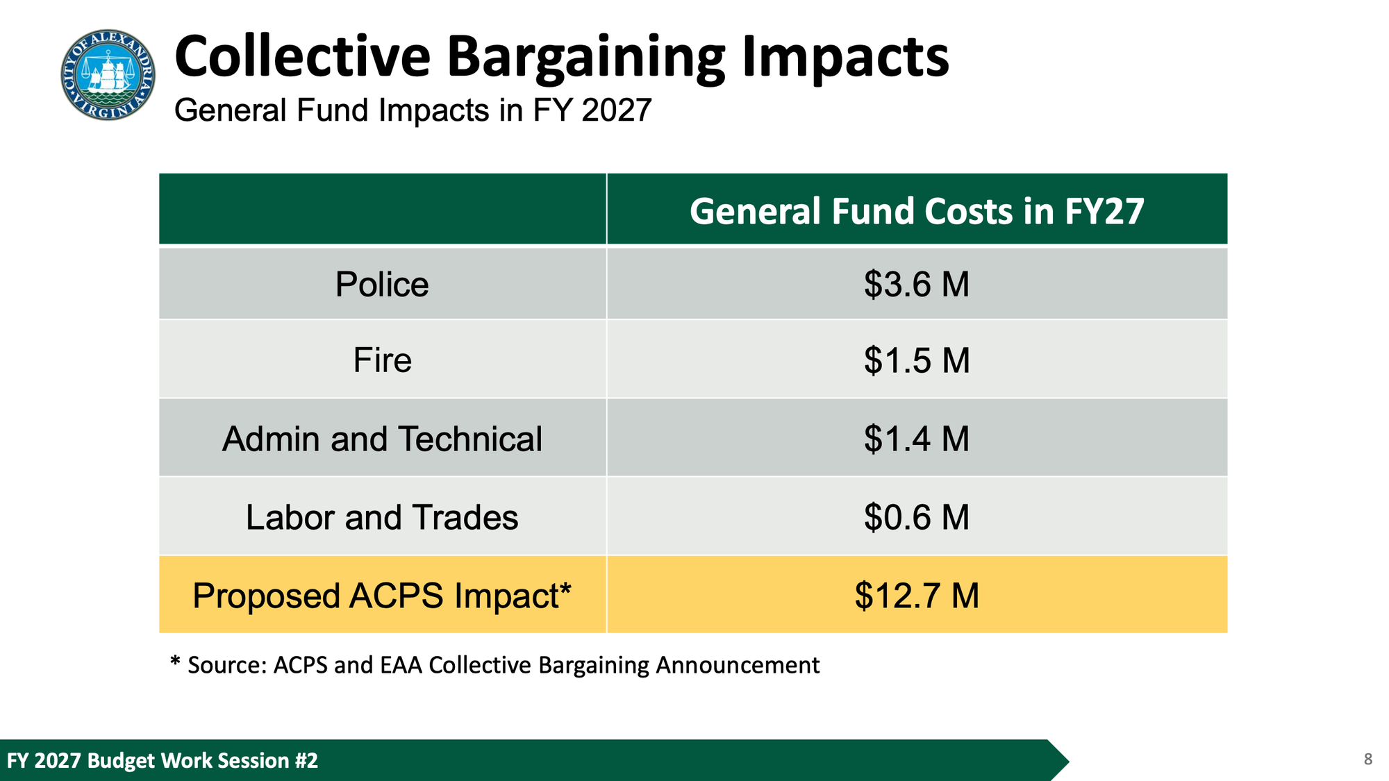 Gaskins laid out the fiscal tension explicitly. The city's total new general fund revenue growth for FY2027 is approximately $20 million, she said. The proposed ACPS collective bargaining agreement alone would cost $12.7 million. Funding it at that level, she said, would consume the bulk of the city's entire new growth, leaving little for debt service obligations or investments across the city's more than 30 other departments.