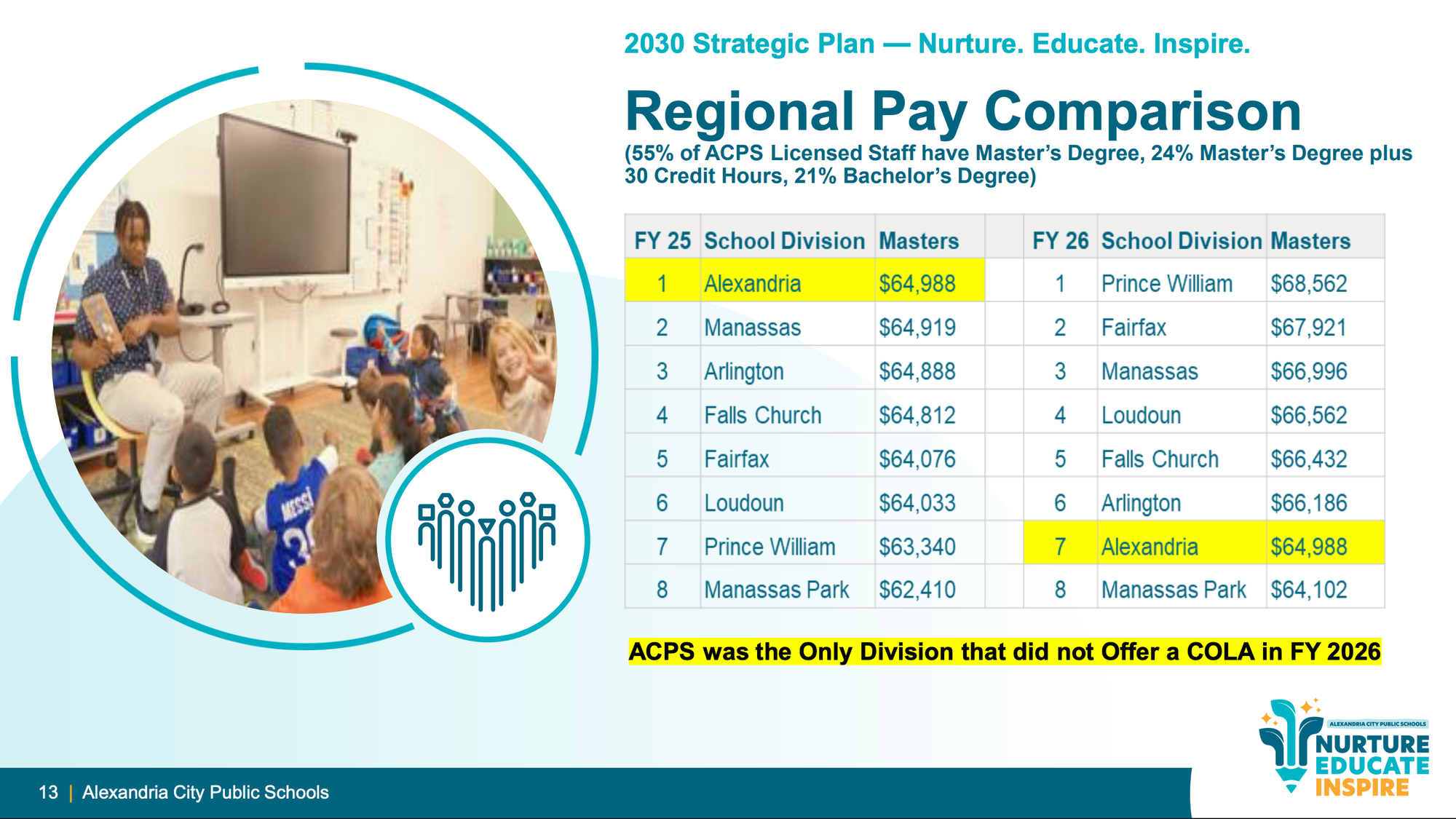 In FY2025, Alexandria ranked first in the region in starting pay for teachers with master's degrees. In FY2026 — the year ACPS was unable to offer a cost-of-living adjustment because of budget constraints — it fell to seventh. Several outer jurisdictions, including Loudoun and Prince William counties, buoyed by data center tax revenue unavailable to Alexandria, are now offering larger compensation increases.